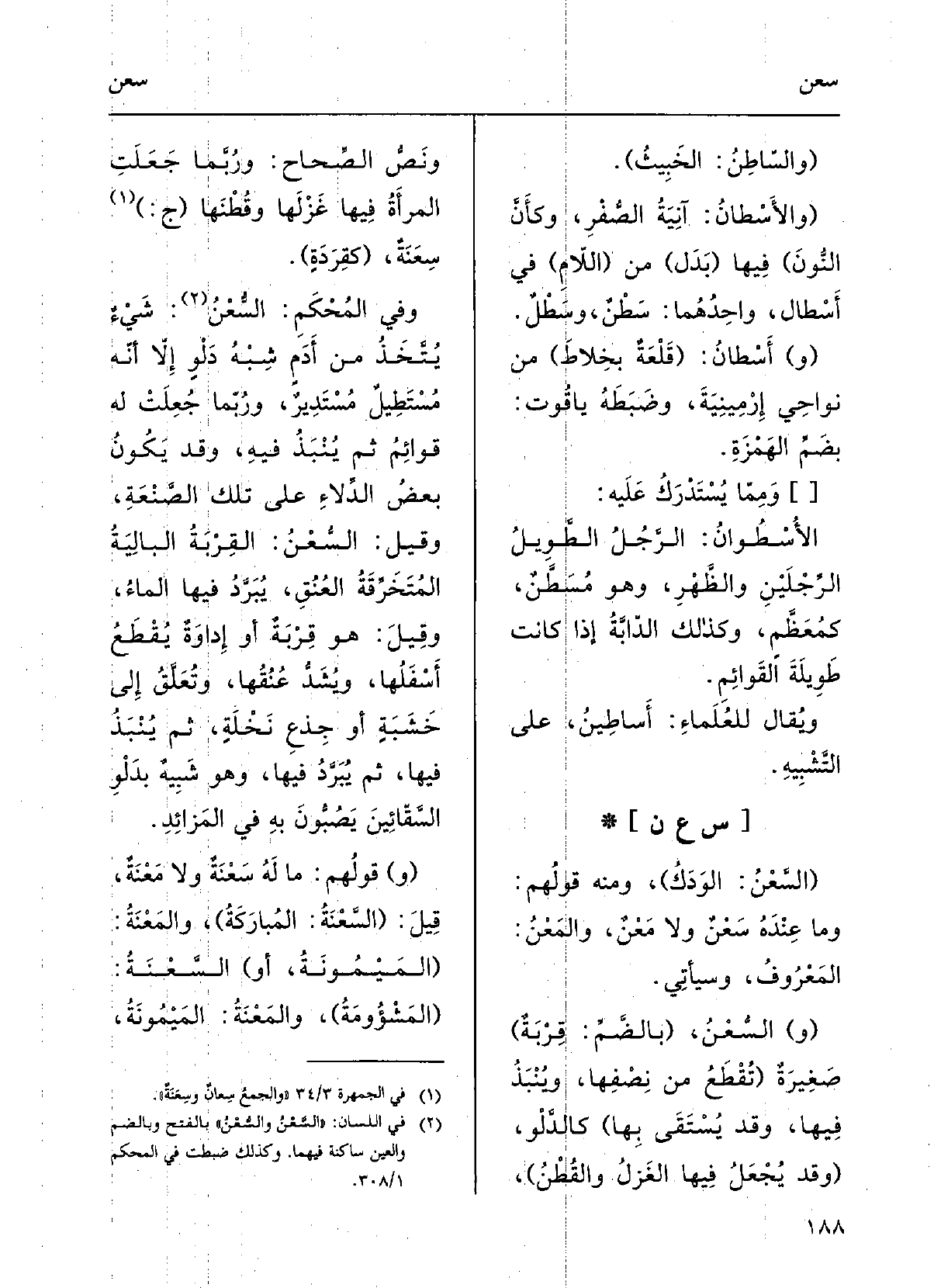 (و) قوْلُهم: مَاله سَعْنةٌ وَلَا مَعْنةٌ، قيلَ: (السَّعْنَةُ: المُبارَكَةُ) ، والمَعْنةُ: (المَيْمونَةُ؛ أَو) السَّعْنةُ: (المشْؤُومَةُ) ، والمَعْنةُ: المَيْمونَةُ،