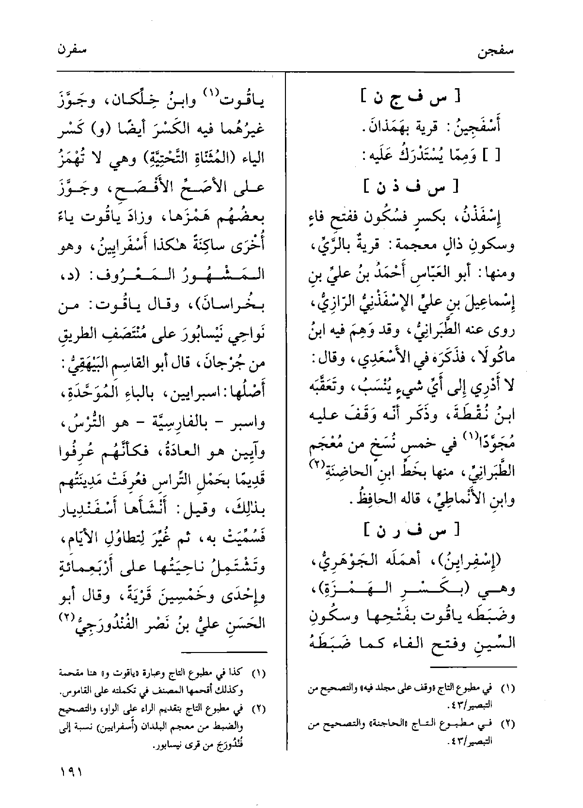 :) سْفَذْنُ، بكسرٍ فسكونٍ ففتحِ فاءٍ وسكونِ ذالٍ معْجمَةٍ: قرْيَةٌ بالرَّيِّ، وَمِنْهَا: أَبو العبَّاسِ أَحمدُ بنُ عليِّ بن إِسْمعيلَ بنِ عليَ الإِسْفَذْنيُّ الرَّازِيُّ، رَوَى عَنهُ الطّبْرانيُّ، وَقد وَهِمَ فِيهِ ابنُ مَاكُولَا فذَكَرَه فِي الاسعدي، وقالَ: لَا أَدْرِي إِلَى أَي شيءٍ يُنْسَبُ؛ وتَعَقَّبَه ابنُ نقْطَة وذَكَرَ أنّه وَقَفَ على مجلّدٍ فِيهِ خَمْس نسخٍ مِن معْجَمٍ الطّبْرانيّ، مِنْهَا بخطِّ ابْن الحاجنة وابنِ الأَنْماطيّ، قالَهُ الحافِظُ.