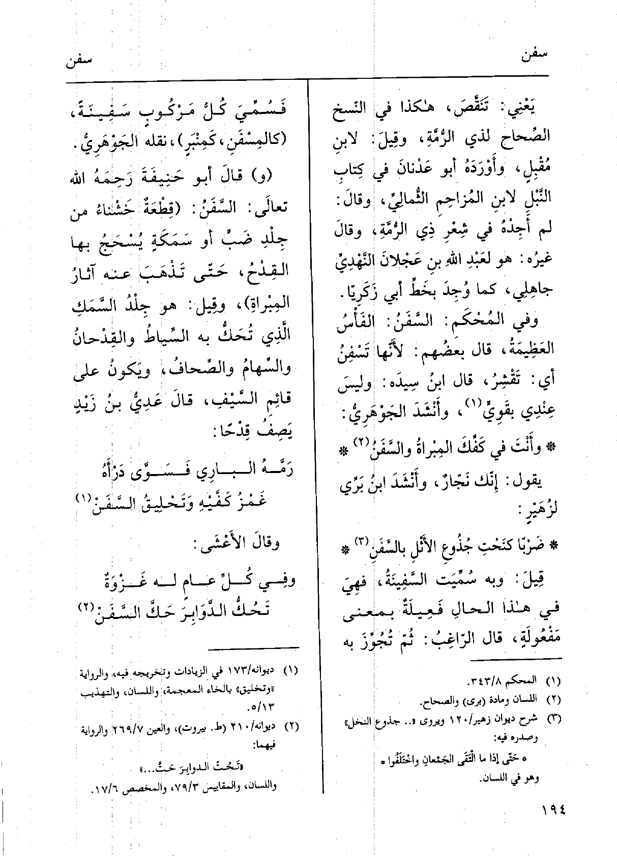 (و) قالَ أَبو حَنِيفَةَ، رَحِمَه الّلهُ تعالَى: السَّفَنُ (قِطْعَةٌ خَشْناءُ من جِلْدِ ضَبَ، أَو سَمَكَةٍ يُسْحَجُ بهَا القِدحُ حَتَّى تَذْهَبَ عَنهُ آثارُ المِبْراةِ) .