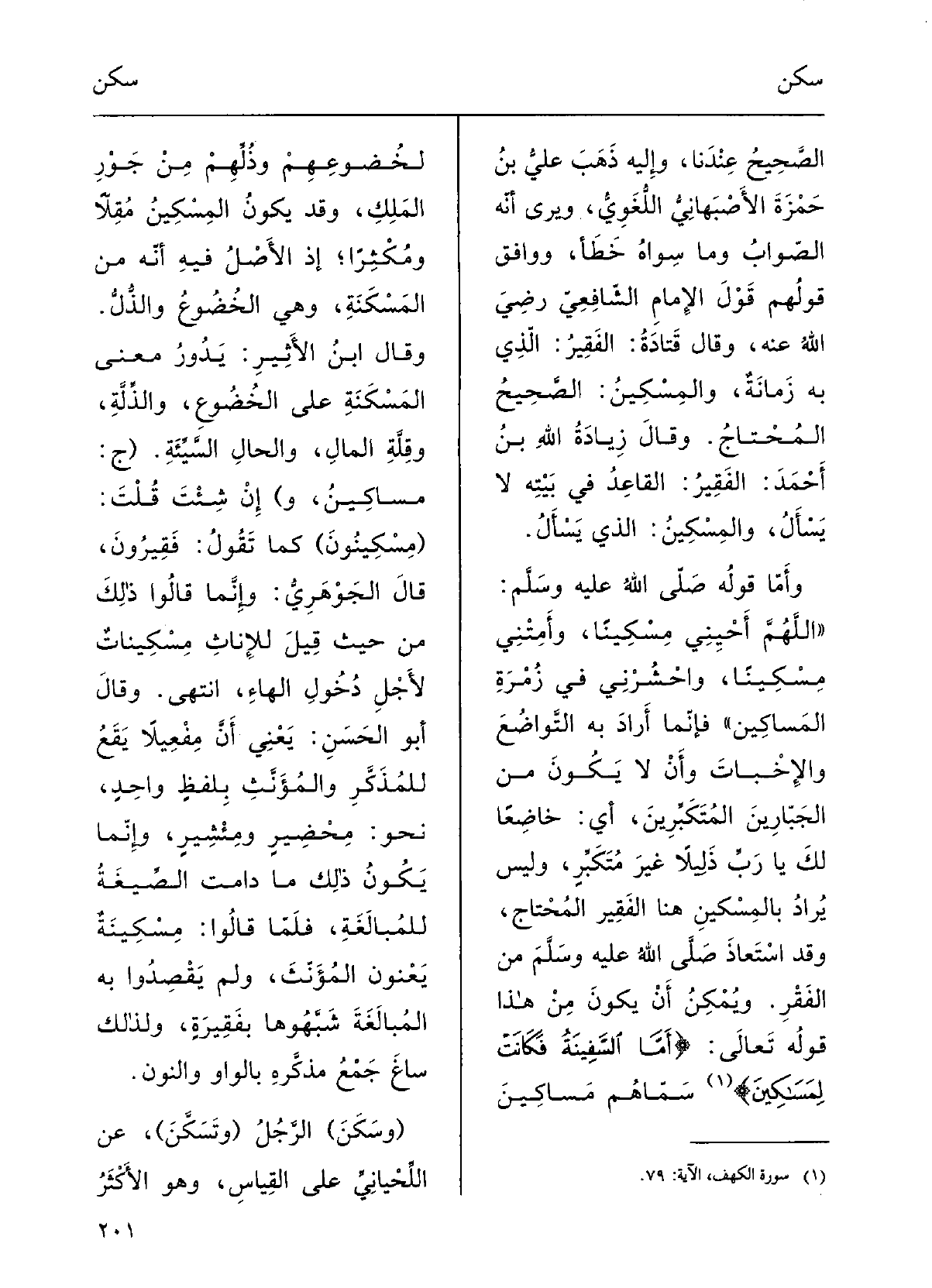 وأَمَّا قَوْله، صلى الله عَلَيْهِ وَسلم (اللَّهُمَّ أَحْينِي مِسْكِيناً وَأمِتْني مِسْكِيناً واحْشُرْني فِي زُمْرَةِ المَساكِين) ، فإنَّما أَرادَ بِهِ التَّواضعَ والإِخْباتَ وأنْ لَا يكون مِن الجبَّارِين المُتَكبِّرِين، أَي خاضِعاً لَك يَا رَبّ ذَلِيلاً غَيْرَ مُتكَبِّرٍ، وليسَ يُرادُ بالمِسْكِينِ هُنَا الفَقِيرُ المُحْتاج، وَقد اسْتَعاذَ، صلى الله عَلَيْهِ وَسلم من الفَقْرِ، ويمكنُ أَنْ يكونَ مِن هَذَا قَوْله تعالَى: {أَمَّا السَّفِينَة فكانتْ لمَسَاكِين} ، سَمَّاهُم مَساكِين لخضُوعِم وذلّهم مِن جَوْرِ الملكِ، وَقد يكونُ المِسْكِينُ مُقِلاًّ ومُكْثِراً، إِذْ الأصْل فِيهِ أنَّه مِنَ المَسْكَنة، وَهِي الخُضُوعُ والذلُّ.