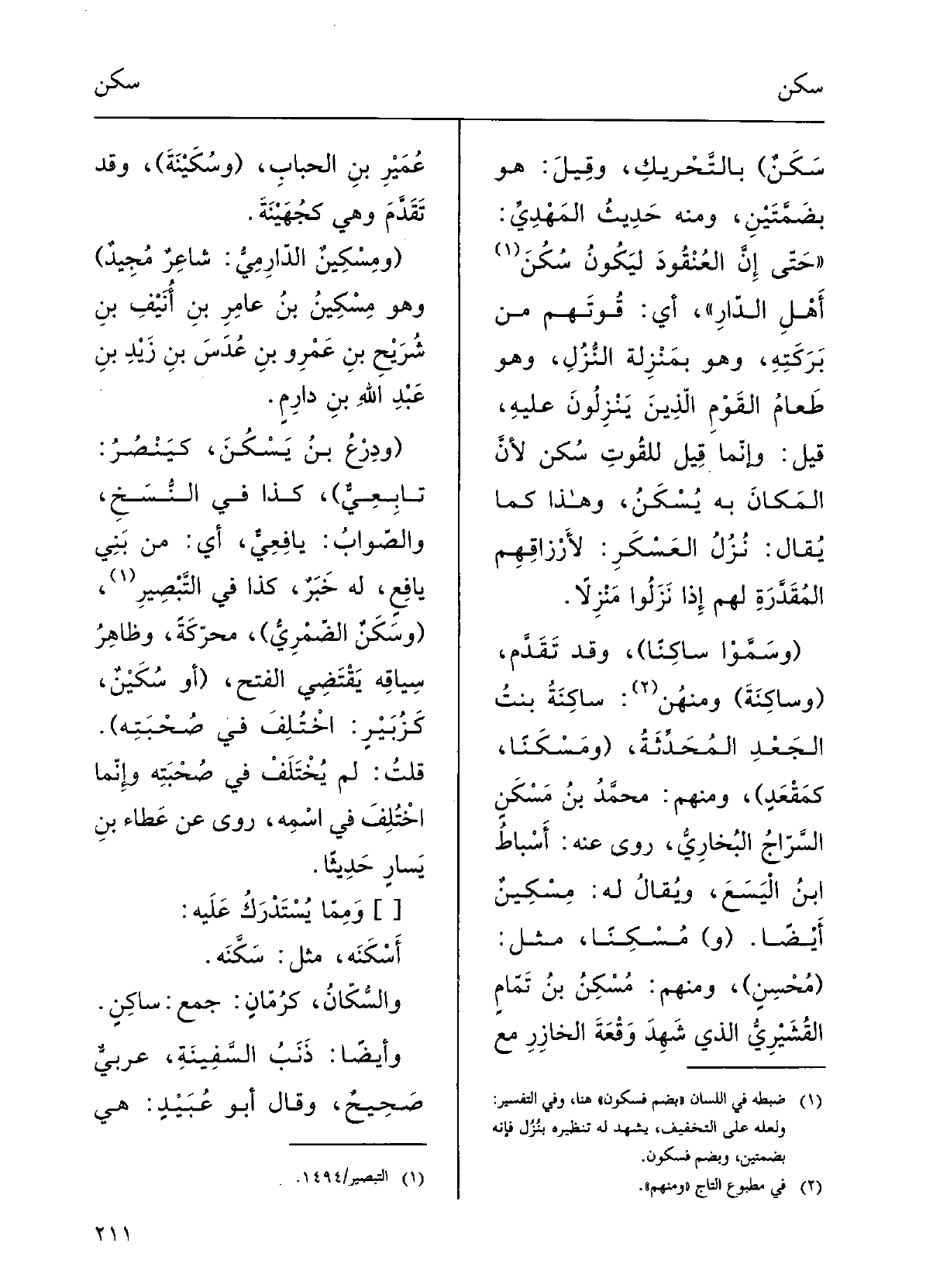 سَكَنٌ) بالتَّحْريكِ، وقيلَ: هُوَ بضمَّتَيْن؛ وَمِنْه حدِيثُ المَهْديّ: (حَتَّى إنَّ العُنْقودَ ليكونَ سُكْنَ أَهْلِ الدارِ) ، أَي قُوتَهم مِن بَرَكَتِه، وَهُوَ بمنْزِلَةِ النُّزْلِ، وَهُوَ طَعامُ القوْمِ الَّذين ينزلُونَ عَلَيْهِ؛ قيلَ: وإنَّما قيلَ للقُوتِ سُكْنٌ لأَنَّ المَكانَ بِهِ يُسْكَنُ، وَهَذَا كَمَا يُقالُ نُزْلُ العَسْكرِ لأَرْزاقِهم المقدَّرَةِ لَهُم إِذا نزلُوا مَنْزِلاً.