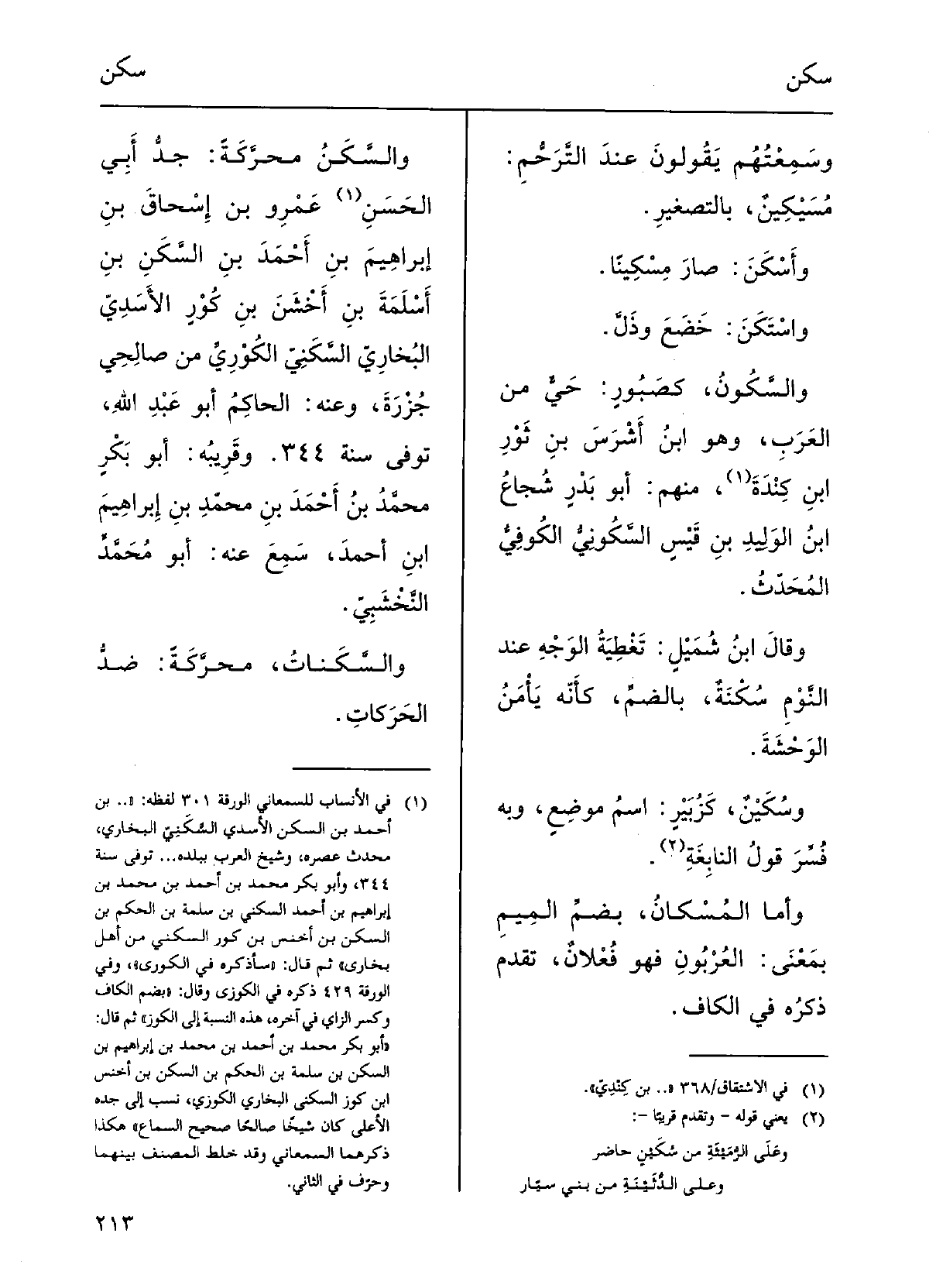 والسَّكَنُ، محرَّكةً: جَدُّ أَبي الحَسَنِ عَمْرو بنِ إِسْحق بنِ إبراهيمَ بنِ أَحمدَ بنِ السَّكَنِ بنِ أَسْلَمَة بنِ أَخْشَن بنِ كورٍ الأَسَديّ البُخارِي السَّكَنيّ الكورِيّ مِن صالِحِي جزْرَةَ، وَعنهُ الحاكِمُ أَبو عبْدِ اللهاِ، تُوفي سَنَة 344، وقَرِيبه أَبو بكْرٍ محمدُ بنُ أَحمدَ بنِ محمدِ بنِ إبراهيمَ بنِ أَحمدَ سَمِعَ عَنهُ أَبو محمدٍ النَّخْشبيّ.