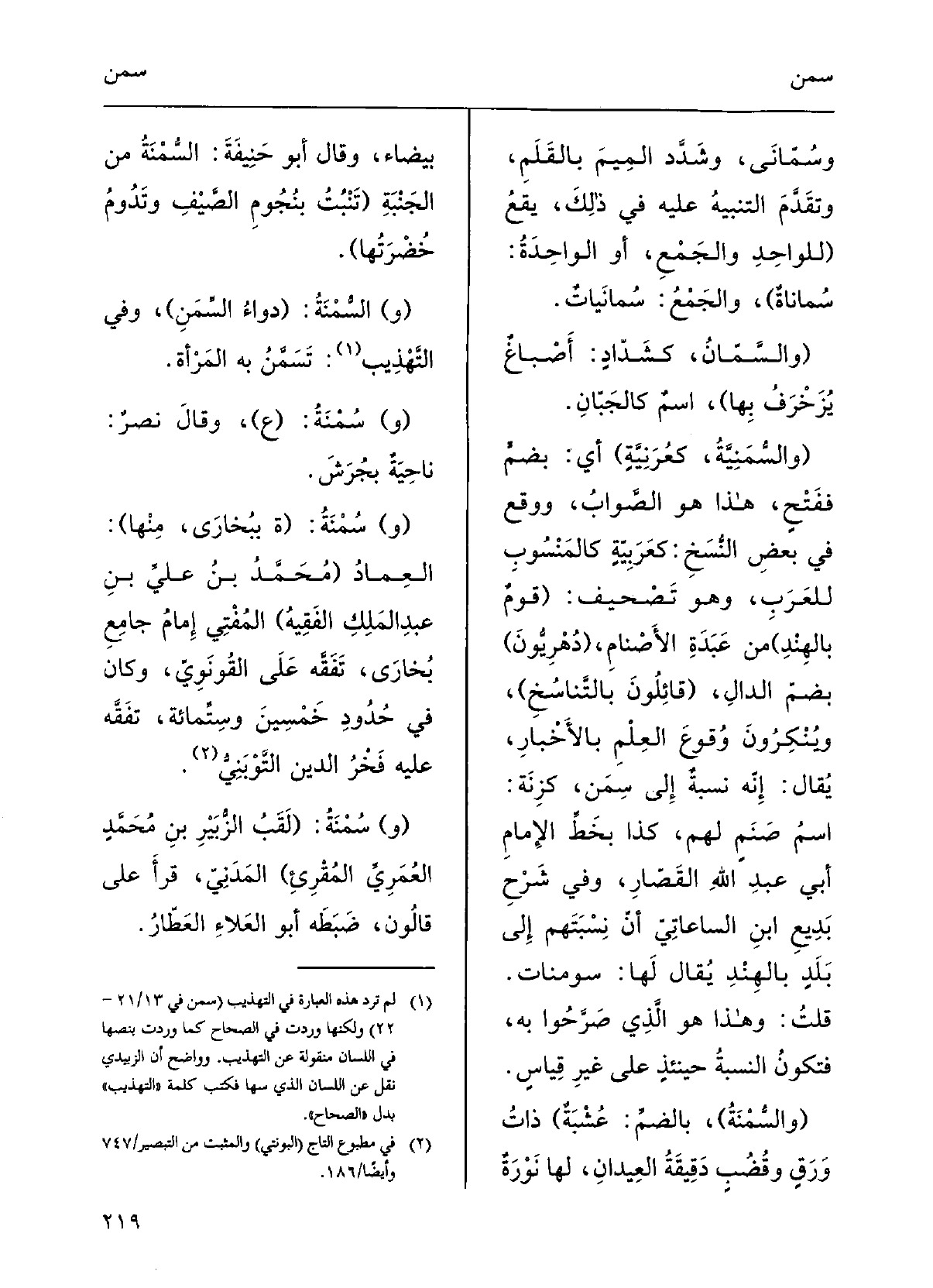 (والسُّمَنِيَّةُ، كعُرَنِيَّةٍ) ، أَي بضمٍ ففتحٍ، هَذَا هُوَ الصَّوابُ، ووَقَعَ فِي بعضِ النسخِ كعَربيَّةٍ كالمَنْسوبِ للعَرَبِ وَهُوَ تَصْحيفٌ، (قوْمٌ بالهِنْدِ) من عبَدَةِ الأَصْنامِ، (دُهْريُّونَ) ، بضمِ الدَّالِ، (قائِلُونَ بالتَّناسُخِ) ويُنْكِرُونَ وُقُوعَ العِلْم بالإِخْبارِ، ويقالُ: إنَّه نسْبَةٌ إِلَى سِمَنٍ، كزِنَةٍ، اسمُ صَنَمٍ لَهُم. كَذَا بخطِّ الإمامِ أَبي عبْدِ الّلهِ القصَّار.