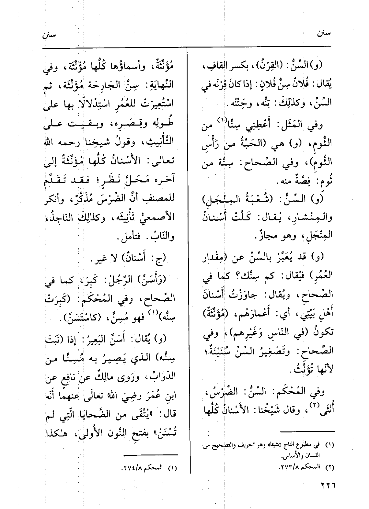 وقوْلُ شيْخُنا، رحِمَه الّلهُ تَعَالَى: الأَسْنانُ كُلُّها مؤَنَّثَةٌ إِلَى آخِرِه، محلُّ نَظَرٍ؛ فقد تقدَّمَ للمصنِّفِ أَنَّ الضِّرْسَ مُذَكَّرٌ، وأَنْكَرَ الأَصْمعيُّ تأْنِيثَه؛ وكذلِكَ الناجِذُ والنابُ، فتأَمَّلْ.