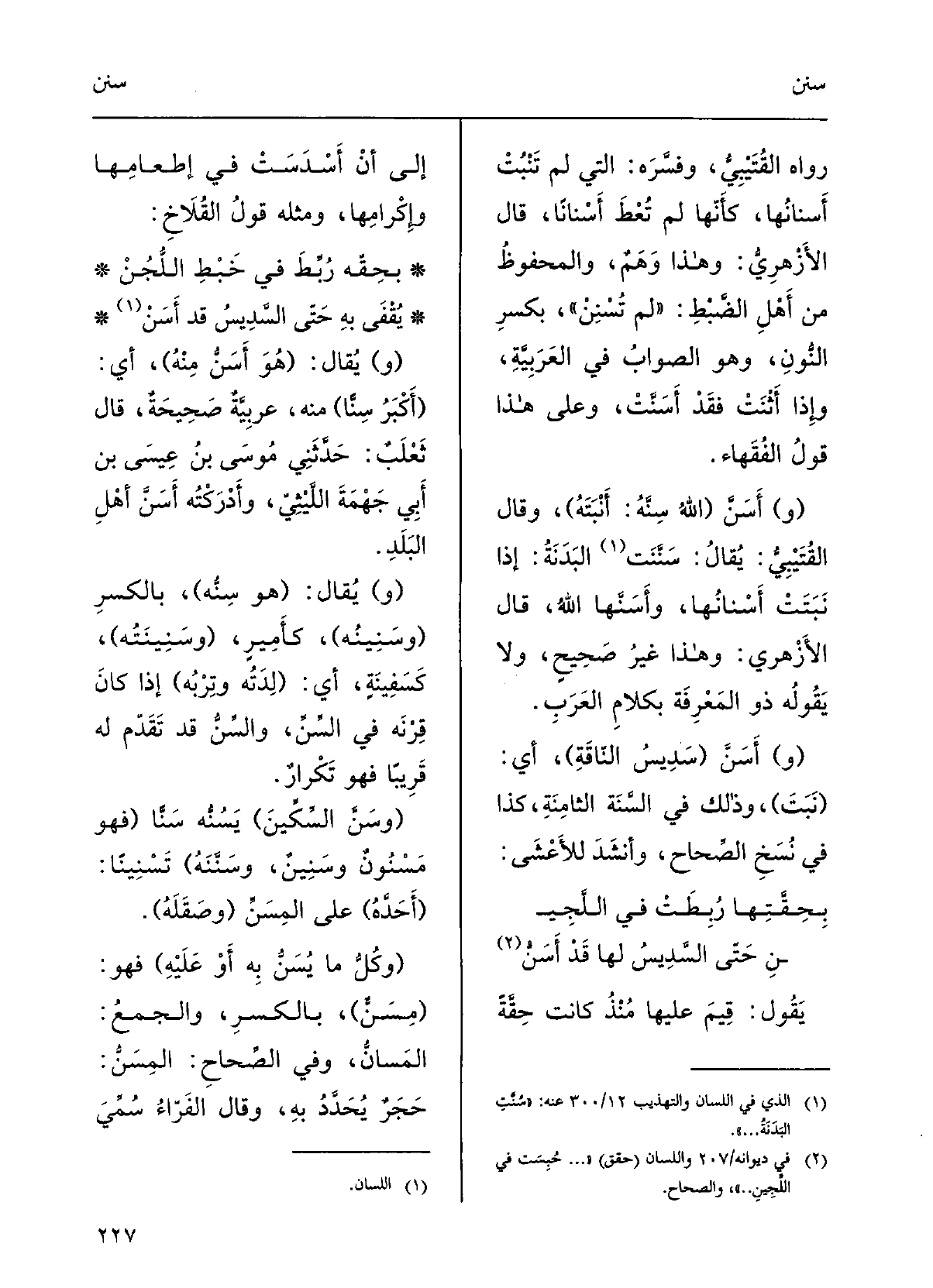 قالَ الأزْهرِيُّ: وَهَذَا وهمٌ والمَحْفوظُ مِن أهْلِ الضبْطِ لم {تُسْنِنْ بكسْرِ النُّونِ، وَهُوَ الصَّوابُ فِي العَربيَّةِ، وَإِذا أَثْنَتْ فقد} أَسَنَّتْ؛ وعَلى هَذَا قَوْل الفُقَهاءِ.