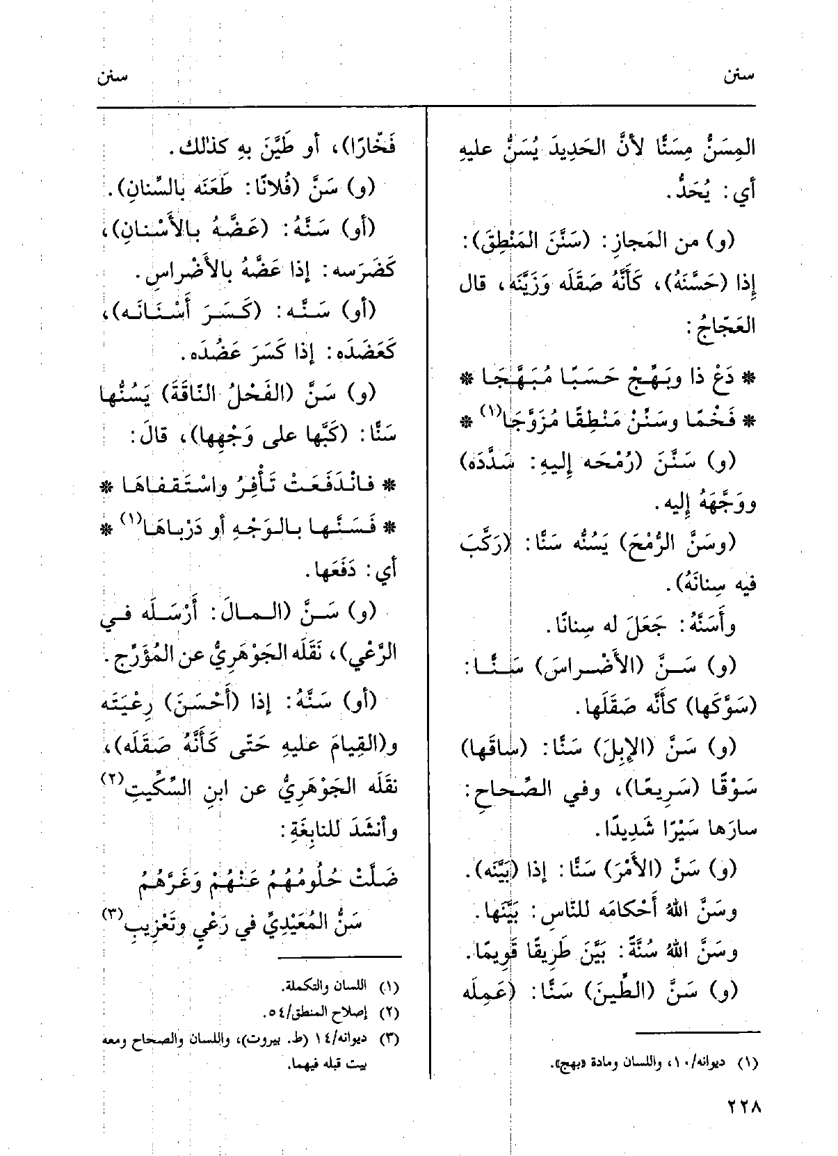 دَعْ ذَا وبَهّجْ حَسَباً مُبَهَّجا فَخْماً} وسَنِّنْ مَنْطِقاً مُزَوَّجا (و) {سَنَّنَ (رُمْحَهُ إِلَيْهِ: سَدَّدَهُ) ووَجَّهَه إِلَيْهِ.