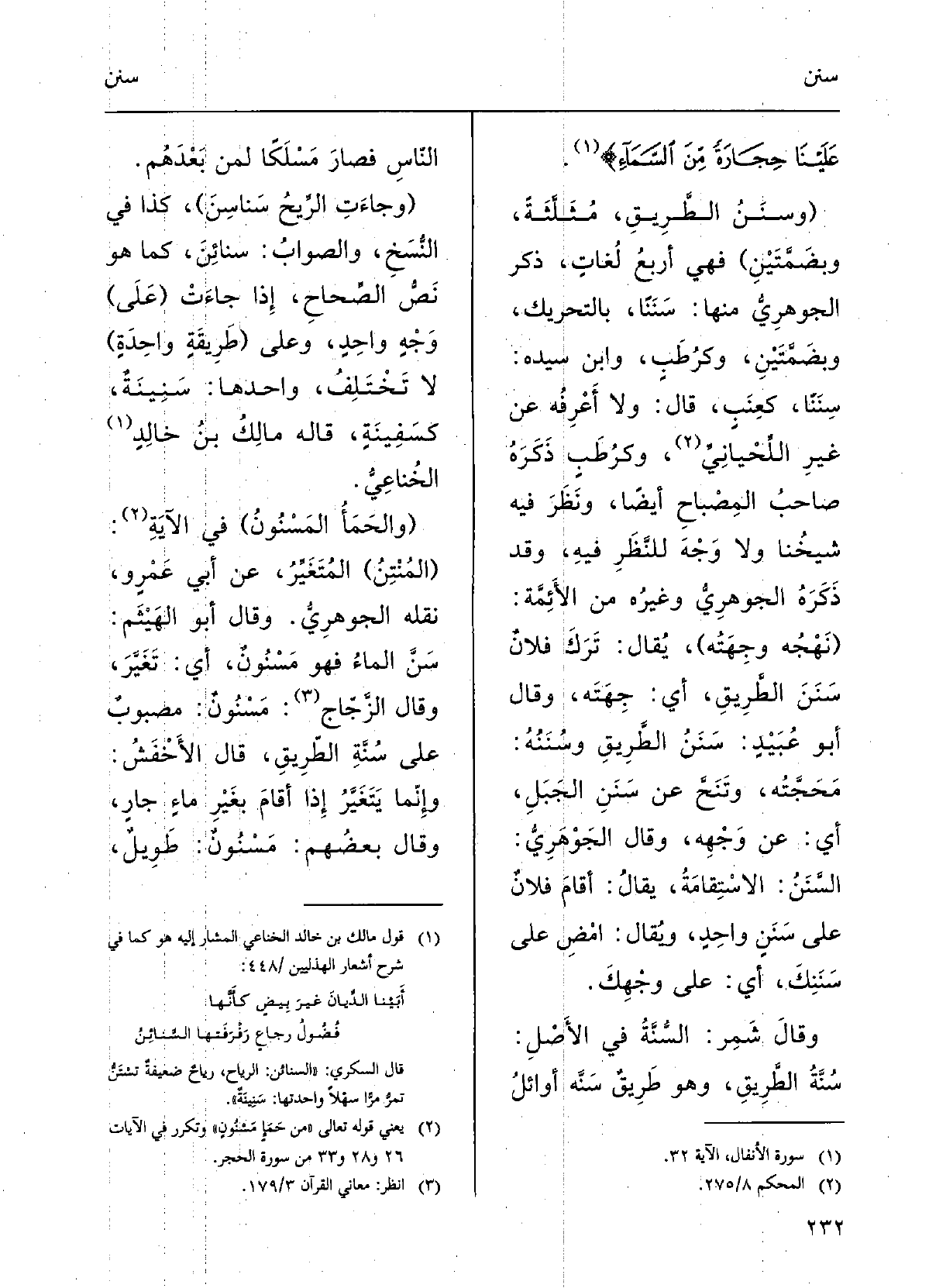 وقالَ الجَوْهرِيُّ: {السَّنَنُ: الاسْتِقامَةُ. يقالُ: أَقامَ فلانٌ على} سَنَنٍ واحِدٍ. ويقالُ: امْضِ على {سَنَنِك أَي على وَجْهِك.