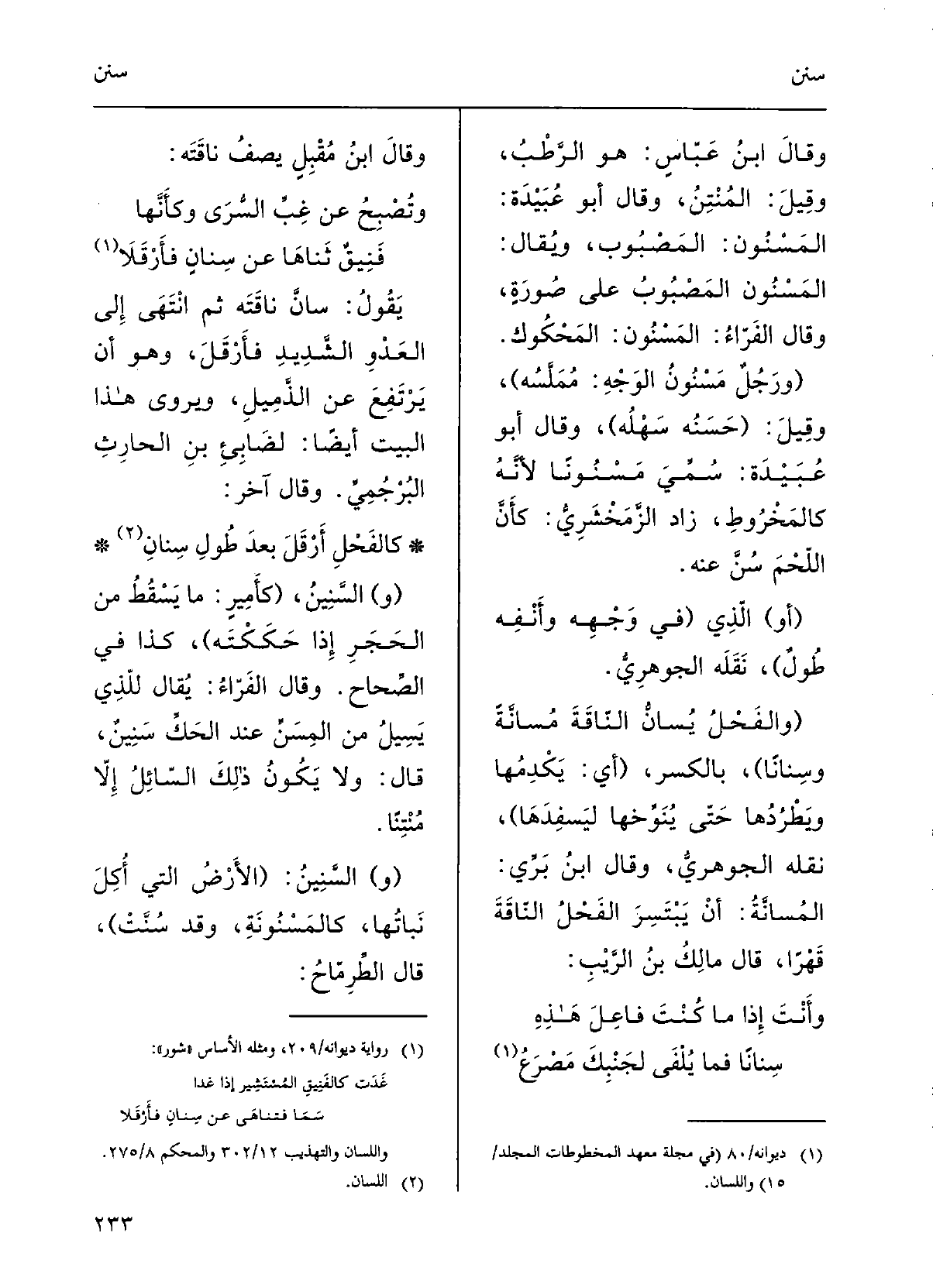 وقالَ أَبُو عُبَيْدَةَ: سُمِّي {مَسْنوناً لأنَّه كالمَخْروطِ؛ زادَ الزَّمَخْشرِيُّ: كأَنَّ اللحْمَ} سُنَّ عَنهُ؛ (أَو) الَّذِي (فِي وَجْهِه وأَنْفِه طُولٌ) ، نَقَلَه الجَوْهرِيُّ.