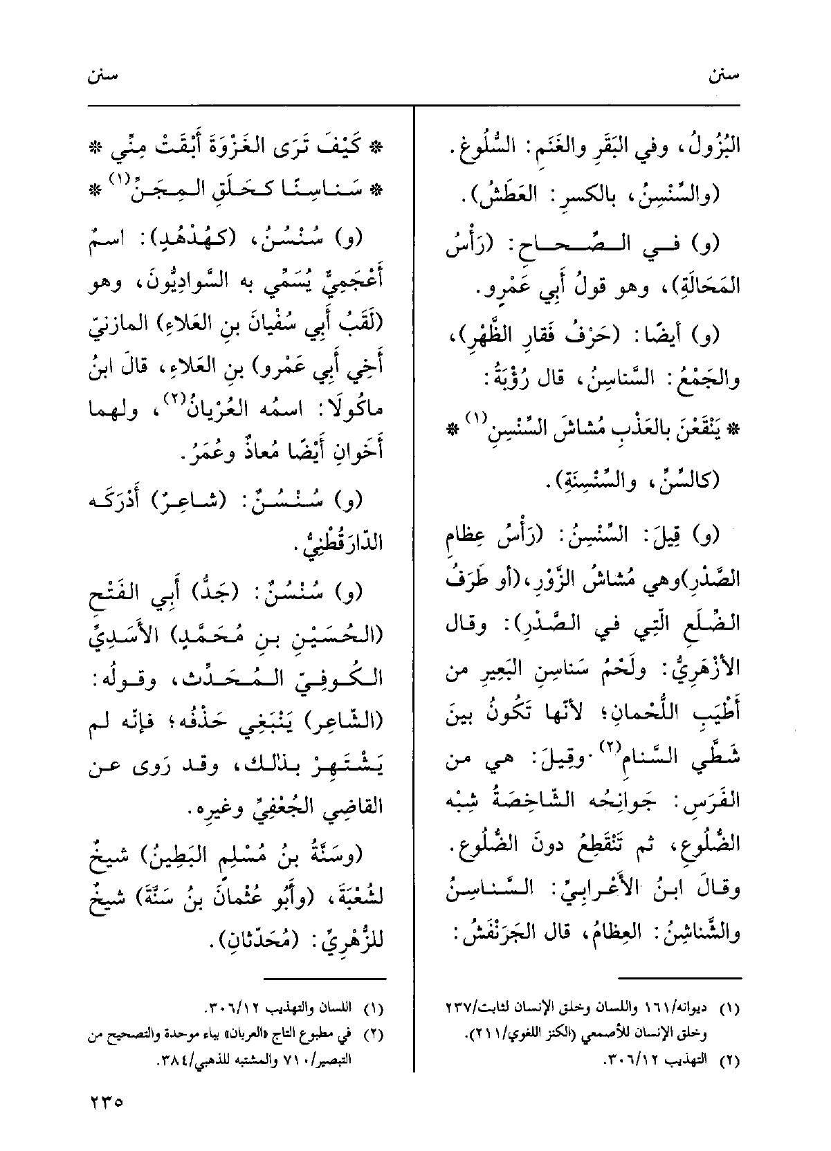 كَيفَ تَرَى الغَزْوَةَ أَبْقَتْ مِني {سَناسِناً كحَلَقِ المِجَنِّ (و) } سُنْسُنُ، (كهُدْهُدٍ) : اسمٌ أَعْجمِيٌّ يُسَمَّى بِهِ السَّوَادِيُّون، وَهُوَ (لَقَبُ أَبي سُفْيانَ بنِ العَلاءِ) المَازِنيّ (أَخِي أَبي عَمْرِو) بنِ العَلاءِ.
