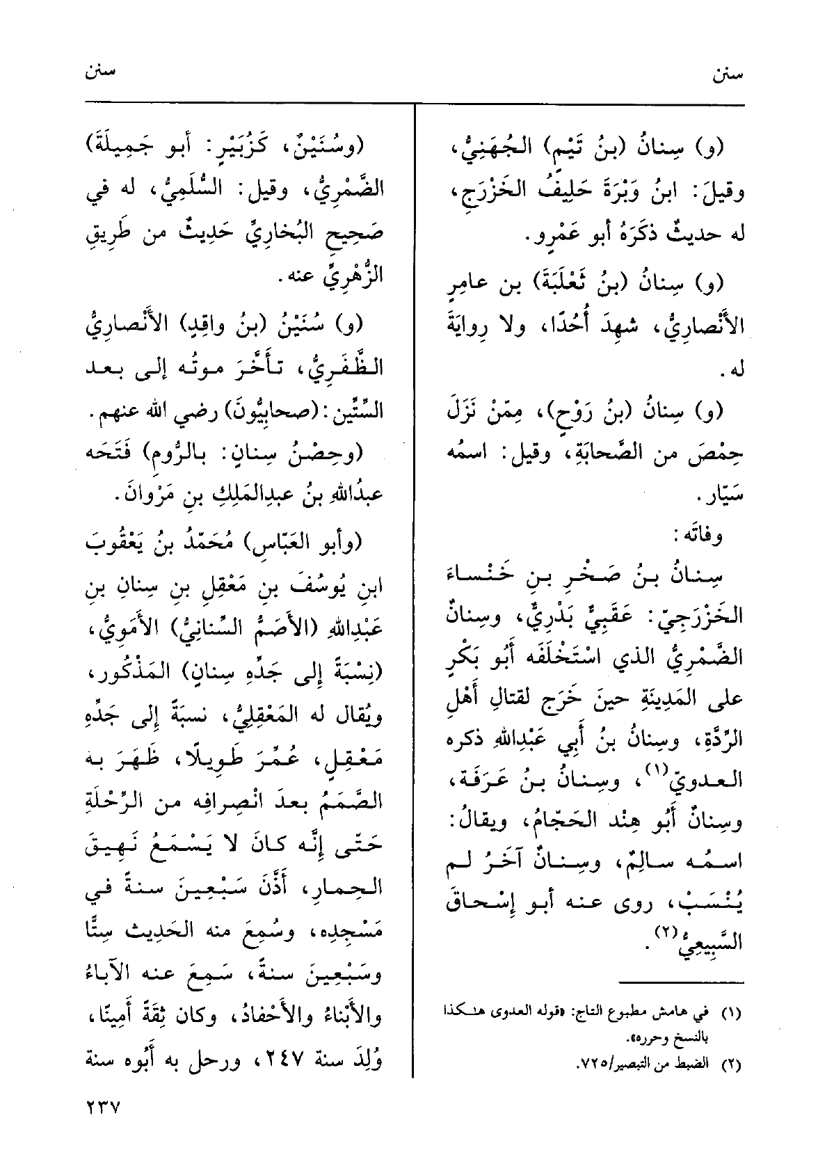 سِنانُ بنُ صَخْرِ بنِ خَنْساء الخَزْرجيُّ عقبيٌّ بدْرِيٌّ؛ {وسِنانٌ الضمْرِيُّ الَّذِي اسْتَخْلَفَه أَبُو بكْرٍ على المَدينَةِ حينَ خَرَجَ لقِتالِ أَهْلِ الردَّةِ؛ وسِنانُ بنُ أَبي عبدِ الّلهِ ذَكَرَه العَدَويُّ؛ وسِنانُ بنُ عَرَفَة؛ وسِنانُ أَبو هنْدٍ الحجَّامُ ويقالُ اسْمُه سالمٌ وسِنانُ آخَرُ لم يُنْسَبْ، رَوَى عَنهُ أَبو إسْحق السُّبَيْعيُّ.