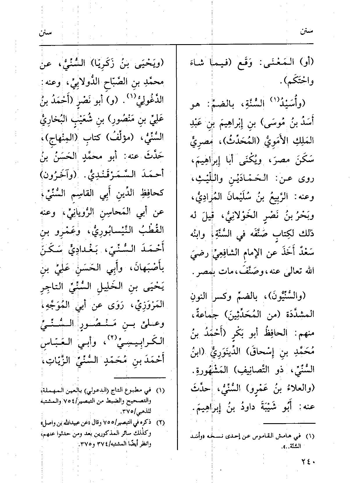 (} والسُّنِّيُّونَ) ، بالضَّمِّ وكسرِ النُّون المشدَّدَةِ، (مِن المُحدِّثِينَ) جماعَةٌ مِنْهُم: الحافِظُ أَبُو بكْرٍ (أَحمدُ بنُ محمدِ بنِ إسْحقَ) الدَّينوريُّ (بن! السُّنِّيِّ، ذُو التَّصانِيفِ المَشْهورَةِ؛ (والعَلاءُ بنُ عَمْرٍ و) السُّنِّيُّ حدَّثَ عَنهُ أَبو شيبَةَ دَاود بنُ إبراهيمَ؛ (ويَحْيَى بنُ زكَرِيَّا) السُّنِّيُّ عَن محمدِ بنِ الصبَّاح الدولابي، وَعنهُ الدعولي؛ (و) أَبو نَصْرٍ (أَحمدُ بنُ عليِّ بنِ مَنْصورِ) بنِ شُعَيبٍ البُخارِيُّ السُّنِّيُّ (مُؤَلِّفُ) كِتابِ (المِنْهاجِ) ، حدَّثَ عَنهُ أَبو محمدٍ الحَسَنُ بنُ أَحمدَ السَّمَرْقَنْديّ، (وآخَرُونَ) كحافِظِ الدِّيْن أَبي إبْراهيمَ إسْمعيل بنِ أَبي القاسِمِ السُّنِّيِّ عَن أَبي المحاسِنِ الرُّويانيّ، وَعنهُ القطبُ النَّيْسابُوريُّ؛ وعَمْرو بن أَحْمدَ السُّنِّيّ بَغْدادِي سَكَنَ بأَصْبَهان؛ وأَبي الحَسَنِ عليّ بن يَحْيَى بنِ الخَلِيلِ السُّنِّيّ التَّاجِر المَرْوَزيّ رَوَى عَن أَبي الموجه؛ وعليِّ بنِ مَنْصورٍ السُّنِّيّ الكَرَابِيسي؛ وأَبي العبَّاس أَحمدَ بنِ محمدٍ السُّنِّيّ الزيَّات؛