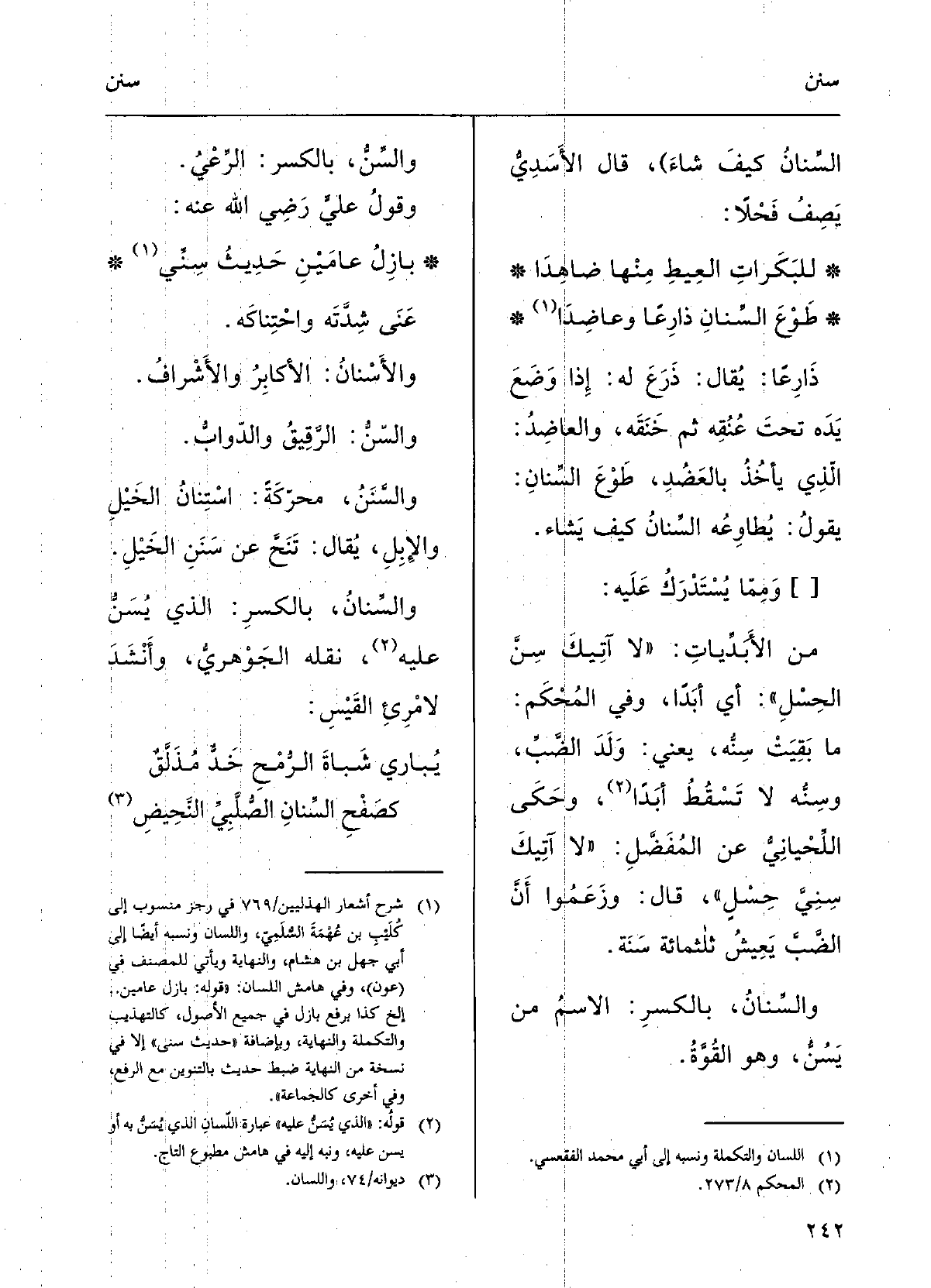 } والسِّنُّ بالكسْرِ: الرَّعْيُ؛ وقوْلُ عليَ، رضِيَ الّلهُ تعالَى عَنهُ: