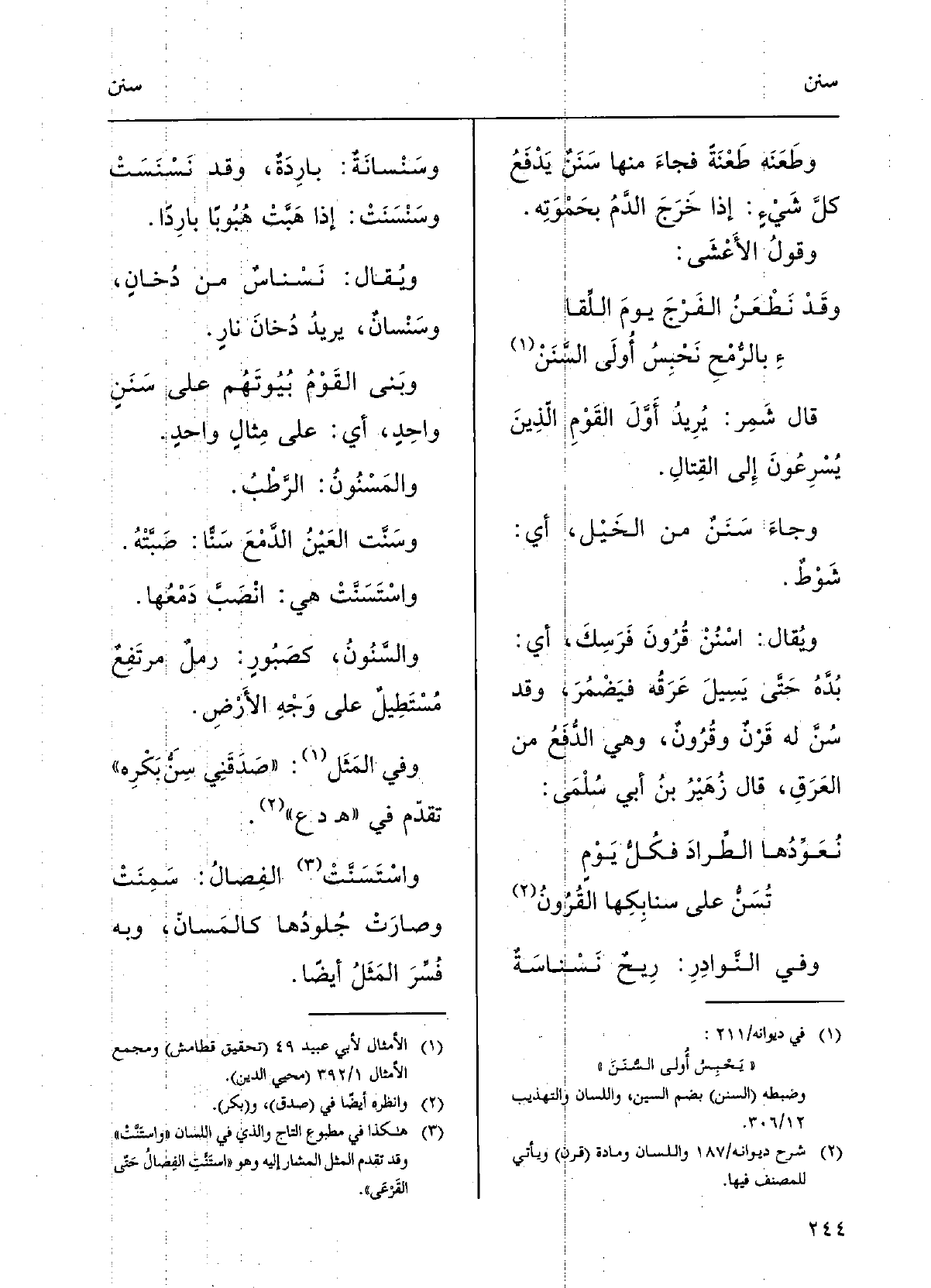 {وسَنَّتِ العَيْنُ الدَّمْعَ} سَنّاً: صَبَّتُه؛ {واسْتَسَنَّتْ هِيَ انصَبَّ دَمْعُها.