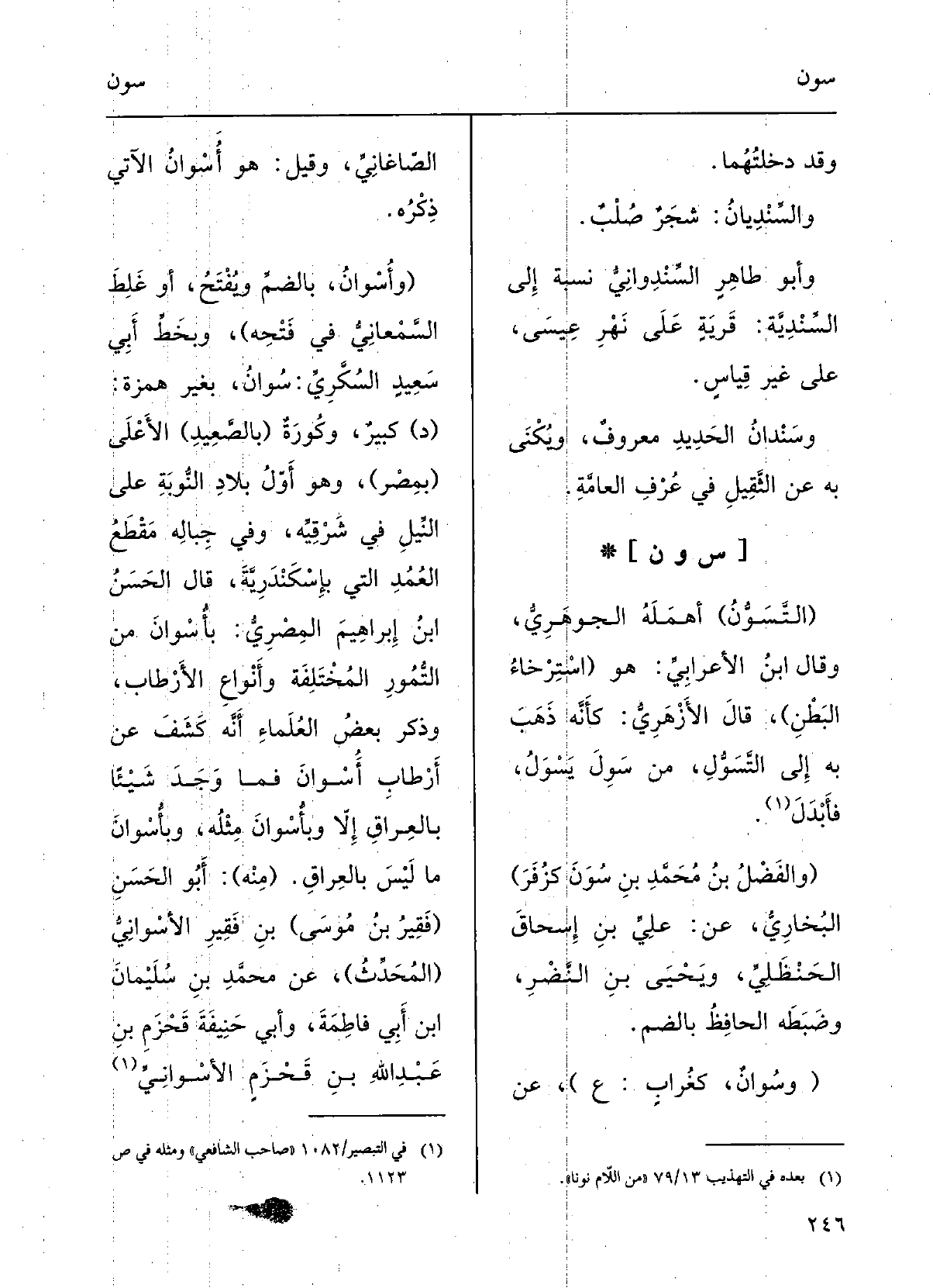 ( {وأُسوانُ، بالضَّمِّ ويُفْتَحُ، أَو غَلِطَ السّمْعانيُّ فِي فَتْحِه) ، وبخطِّ أَبي سعيدٍ السّكَّريّ} سُوَانُ بغيرِ هَمْزةٍ: (د) كَبيرٌ وكُورَةٌ (بالصَّعيدِ) الأَعْلَى (بمِصْرَ) ، وَهُوَ أَوَّلُ بلادِ النَّوْبةِ على النَّيلِ فِي شرقيه، وَفِي جِبالِه مقطعُ العُمُدِ الَّتِي بأسْكَنْدرِيَّة.