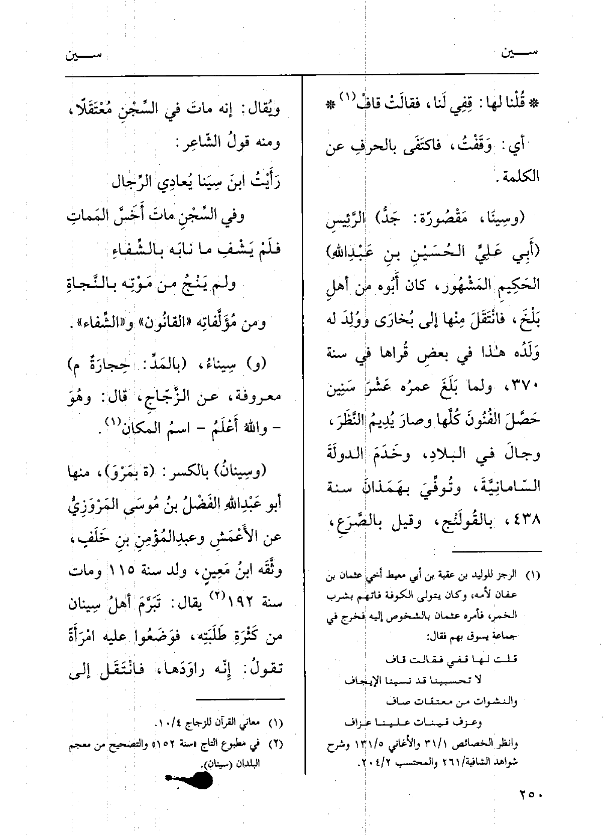 ( {وسِيْنا، مَقْصورَةً: جَدُّ) الرَّئِيس (أَبي عليَ الحُسَيْنُ بنُ عبدِ الله) الحَكِيم المَشْهور كانَ أَبُوه مِنْ أَهْلِ بَلَخ، فانْتَقَل مِنْهَا إِلَى بُخارَى ووُلِدَ لَهُ ولدُه هَذَا فِي بعضِ قُراها فِي سَنَة 370، ولمَّا بَلَغ عُمره عَشْرَ سِنِيْن حصَّل الفُنُون كُلّها، وصارَ يُدِيم النّظر، وجَالَ فِي البِلادِ وخَدَمَ الدَّولَة السَّامَانِية، وتُوفي بهَمَذَان سَنَة 438 بالقُولَنج، وقيلَ بالصَّرَع، ويقالُ إنَّه ماتَ فِي السِّجْنِ مُعْتقلاً؛ وَمِنْه قوْلُ الشاعِرِ: