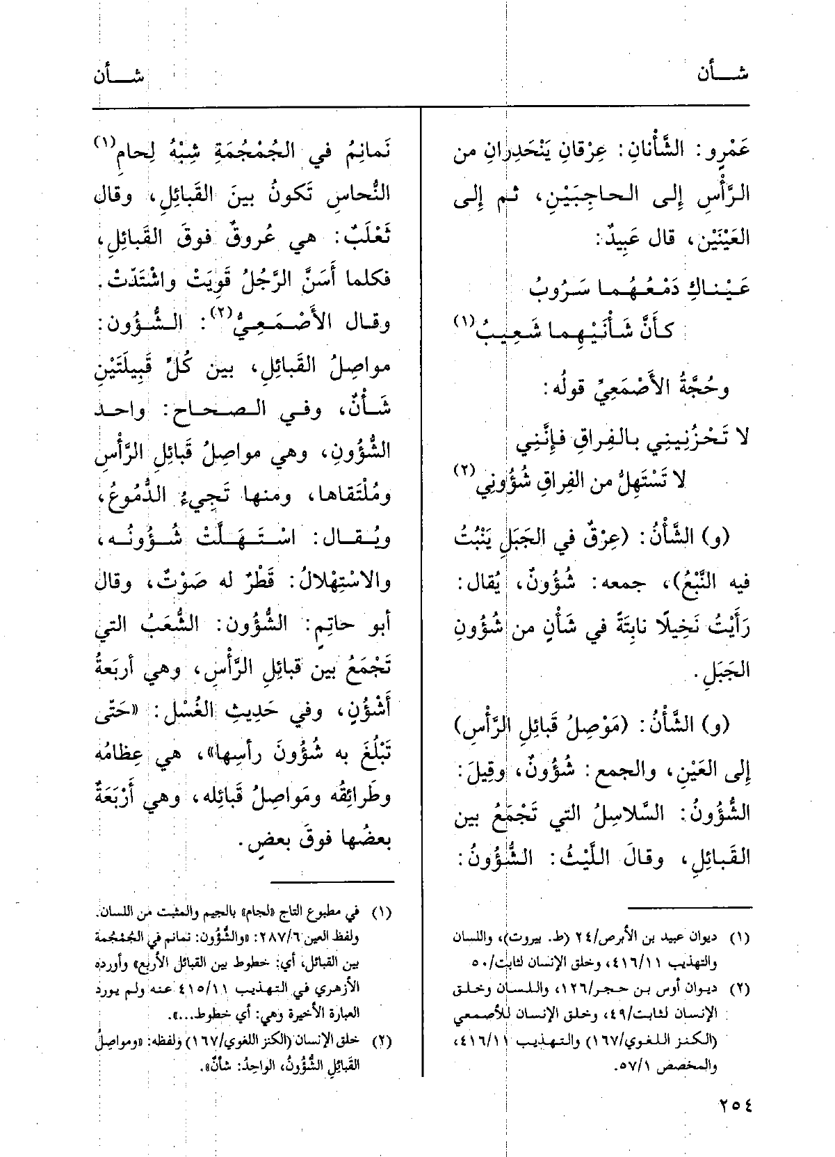 عَمْرٍ و: {الشَّأْنانِ عِرْقان يَنْحدِرَان مِن الرَّأْسِ إِلَى الحَاجِبَيْن ثمَّ إِلَى العَيْنَيْن؛ قالَ عُبَيْد:
