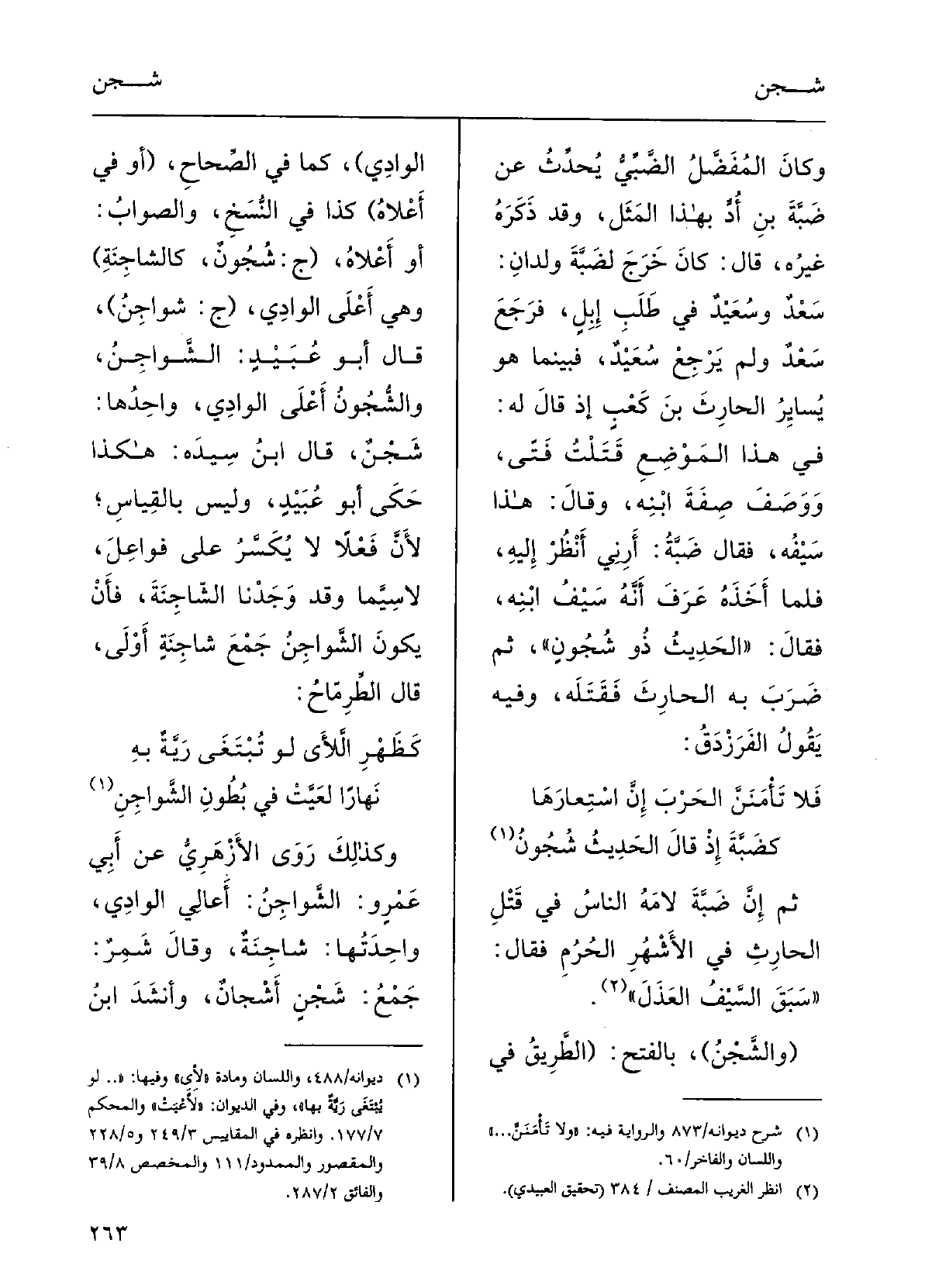 (كظَهرِ اللأَى لَو تُبْتَغَى رِيَّةٌ بهنَهاراً لعَيَّتْ فِي بُطُونِ الشَّواجِنِوكذلِكَ رَوَى الأَزْهريُّ عَن أَبي عَمْرٍ و: الشَّواجِنُ أَعالي الوادِي، واحِدَتُها شاجِنَةٌ.