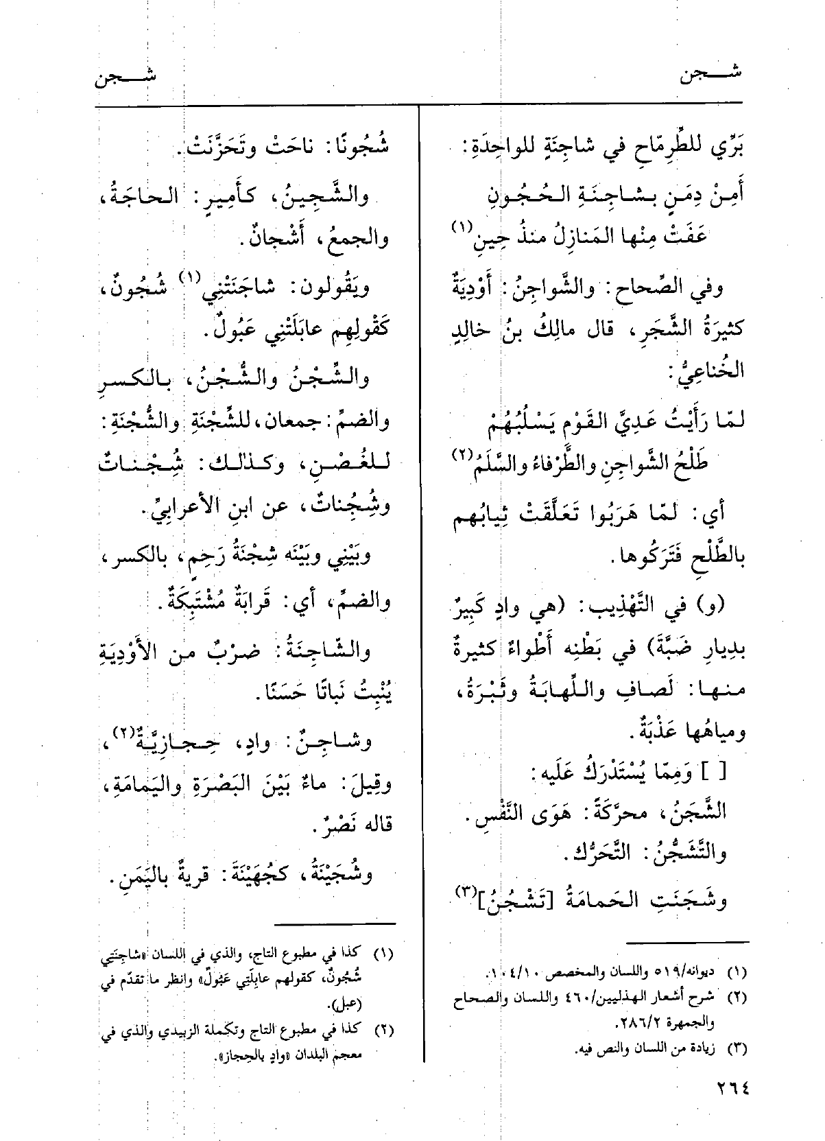 أَمِنْ دِمَنٍ بشاجِنَةِ الحَجُونِعَفَتْ مِنْهَا المَنازِلُ مُنْذُ حِينِوفي الصِّحاحِ: والشَّواجِنُ: أَوْديَةُ كَثيرَةُ الشَّجَرِ؛ قالَ مالِكُ بنُ خالِدٍ الخُنَاعيُّ: