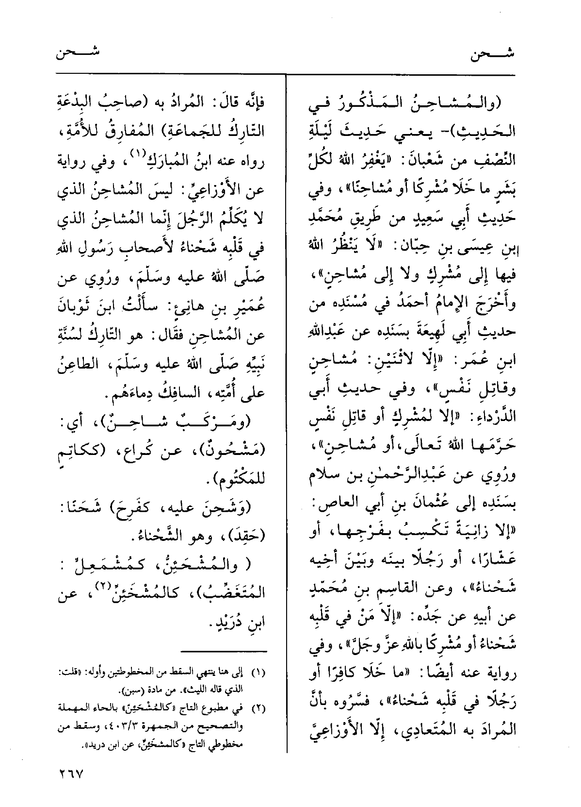 وَفِي حدِيثِ أَبي الدَّرْداء: (إلاَّ لمُشْرِكٍ أَو قاتِل نفْسٍ حَرَّمَها الّلهُ تَعَالَى، أَو مُشاحِن) : (ورُوِي عَن عبدِ الرَّحْمن بنِ سَلام بسَنَدهِ إِلَى عُثْمان بنِ أَبي العاصِ: (إلاَّ زَانِيَة تكْسَبُ بفَرْجِها، أَو عشاراً، أَو رجلا بَيْنه وبينَ أَخِيه شَحْناء) .