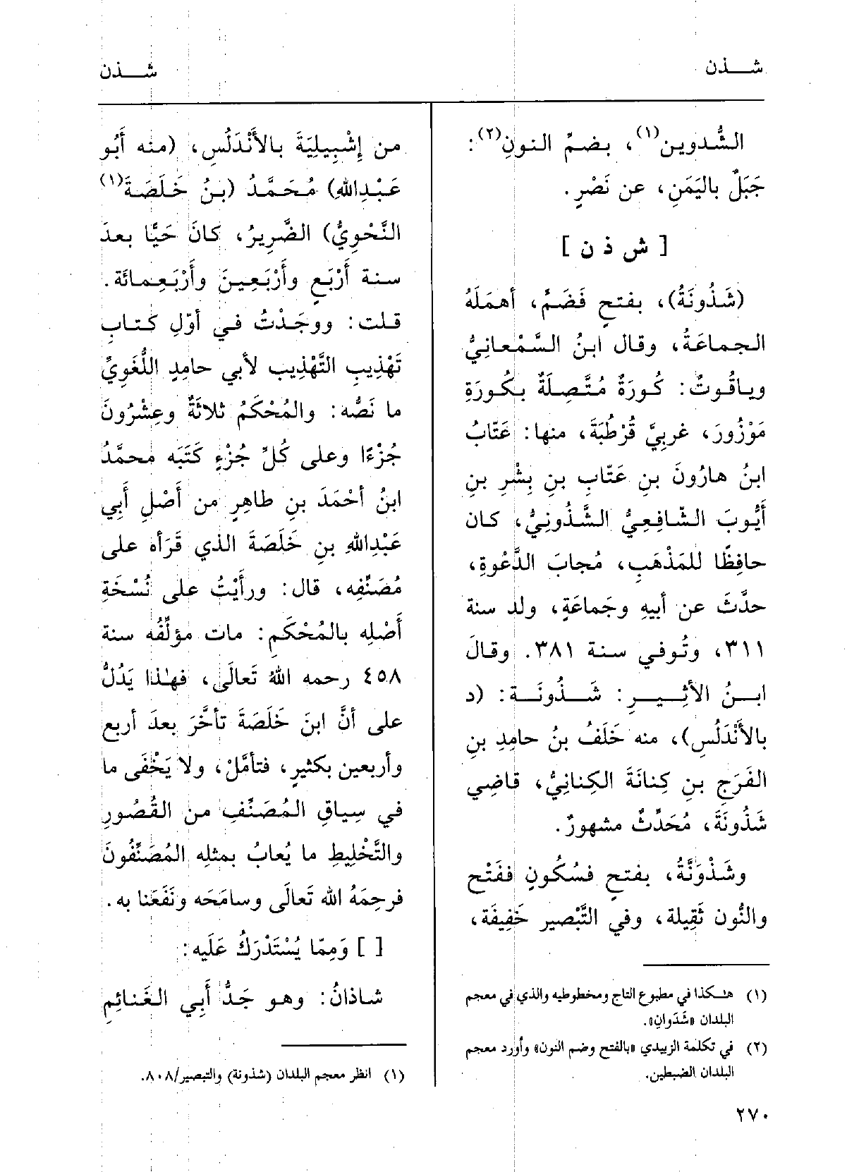 وقالَ ابنُ السَّمعانيُّ وياقوتُ: كُورَةٌ مُتَّصلَةٌ بكُورَةِ موزور غَرْبي قُرْطُبَة، مِنْهَا: عتابُ بنُ هارُون بنِ عتابِ بنِ بشرِ بنِ أَيوب الشافِعِيُّ الشَّذُونيُّ، كَانَ حافِظاً للمَذْهبِ مجابُ الدَّعْوةِ، حدَّثَ عَن أَبيهِ وجماعَةٍ، ولِدَ سَنَة 311، وتُوفي سَنَة 381.