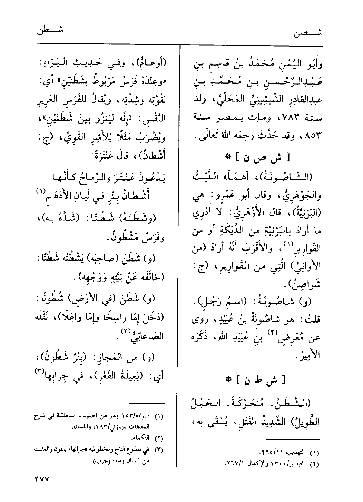شطن: (الشَّطَنُ، محرَّكةً: الحَبْلُ الطَّويلُ) الشَّديدُ الفَتْلِ يُسْقَى بِهِ؛ (أَو عامٌّ) ؛ وَفِي حدِيثِ البرَّاء: (وعنْده فَرَسٌ مَرْبوطٌ بشَطَنَيْن) ، أَي لقوَّتِه وشدَّتِه.