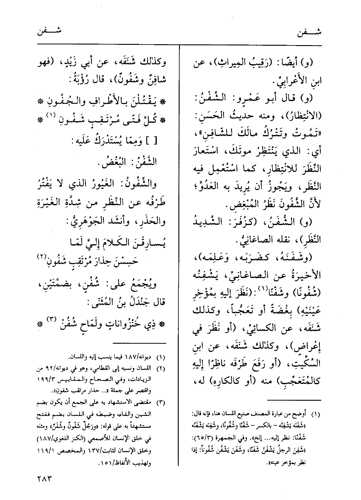 يَقْتُلْنَ بالأَطْرافِ والجُفُونِكُلَّ فَتًى مُرْتَقِبٍ شَفُونِ وممَّا يُسْتدركُ عَلَيْهِ: