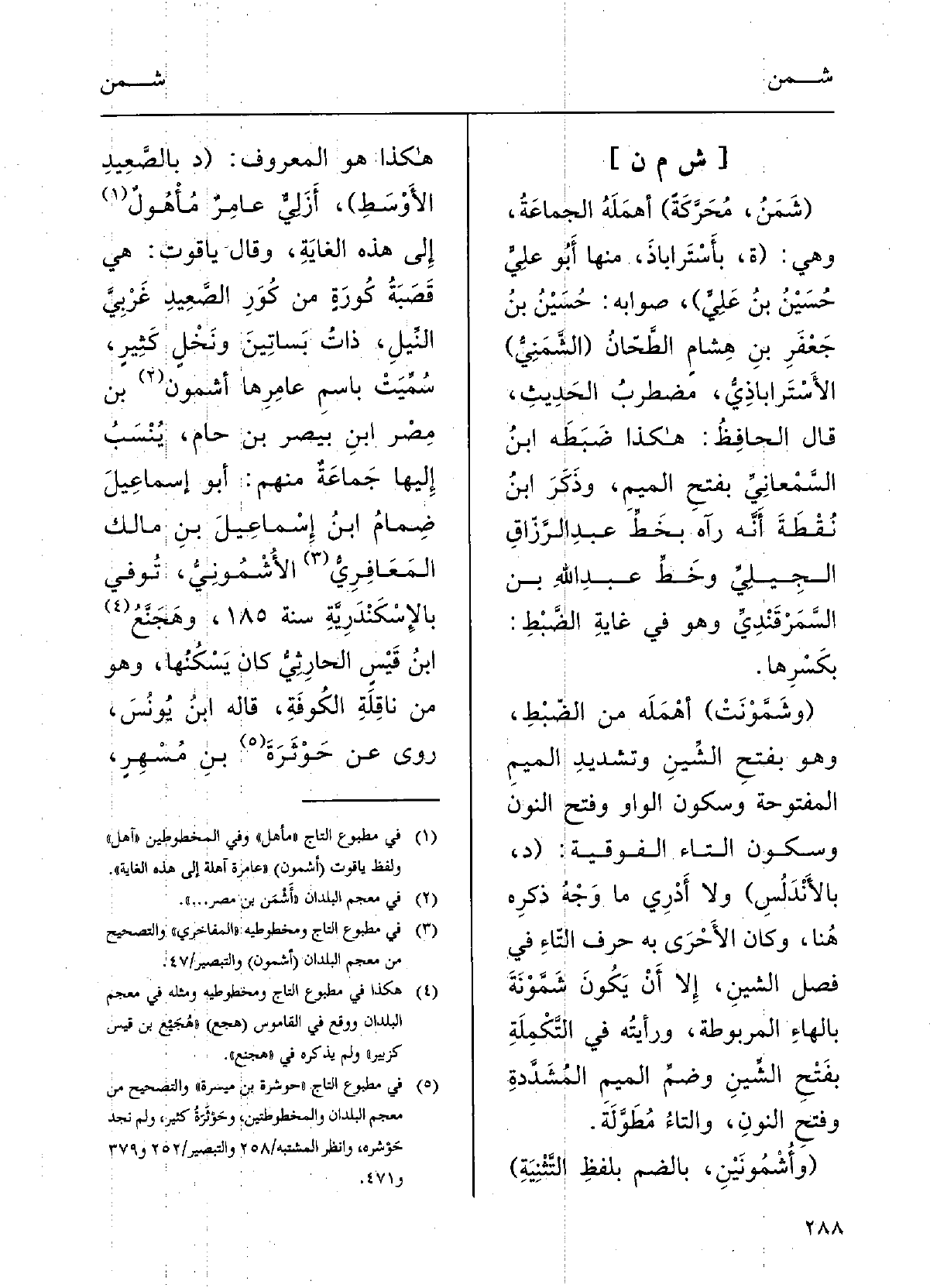 (وشَمَّوْنَتْ) : أَهْمَلَهُ مِن الضَّبْط، وَهُوَ بفتْحِ الشِّيْن وتَشْديدِالميمِ المَفْتوحَةِ وسكونِ الواوِ وفتْحِ النُّونِ وسكونِ التاءِ الفَوْقيَّة: (د بالأَنْدَلُسِ) ؛ وَلَا أَدْرِي مَا وَجْه ذِكْره هُنَا، وَكَانَ الأَحْرَى بِهِ حَرْف التَّاء فِي فصْل الشِّيْن إلاَّ أَن يكونَ شَمَّوْنه بالهاءِ المَرْبُوطَة، ورَأَيْته فِي التّكْمِلَة بفتْحِ الشِّيْن وضمِّ الميمِ المُشَدَّدَةِ وفتْحِ النُّونِ والتَّاءِ مُطَوَّلة.