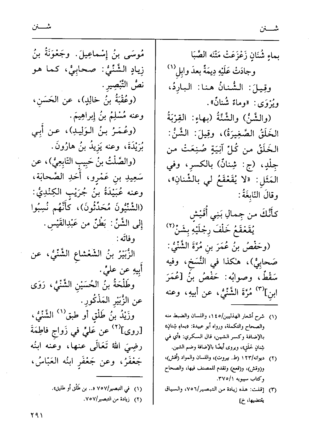 الزُّبَيْرُ بنُ الشعشاعِ الشَّنِّيُّ عَن أَبيهِ عَن عليَ. وطلحَةُ بنِ الحُسَيْنِ الشَّنِّيُّ رَوَى عَن الزُّبَيْر المَذْكورِ. وزَيْدُ بنُ طَلْقٍ، أَو طبقٍ، الشَّنّيُّ عَن عليَ فِي زَوَاجِ فاطِمَةَ، رضِيَ اللهاُ تعالَى عَنْهَا، وَعنهُ ابنُه جَعْفَر، وَعَن جَعْفر ابنُه العبَّاسُ،