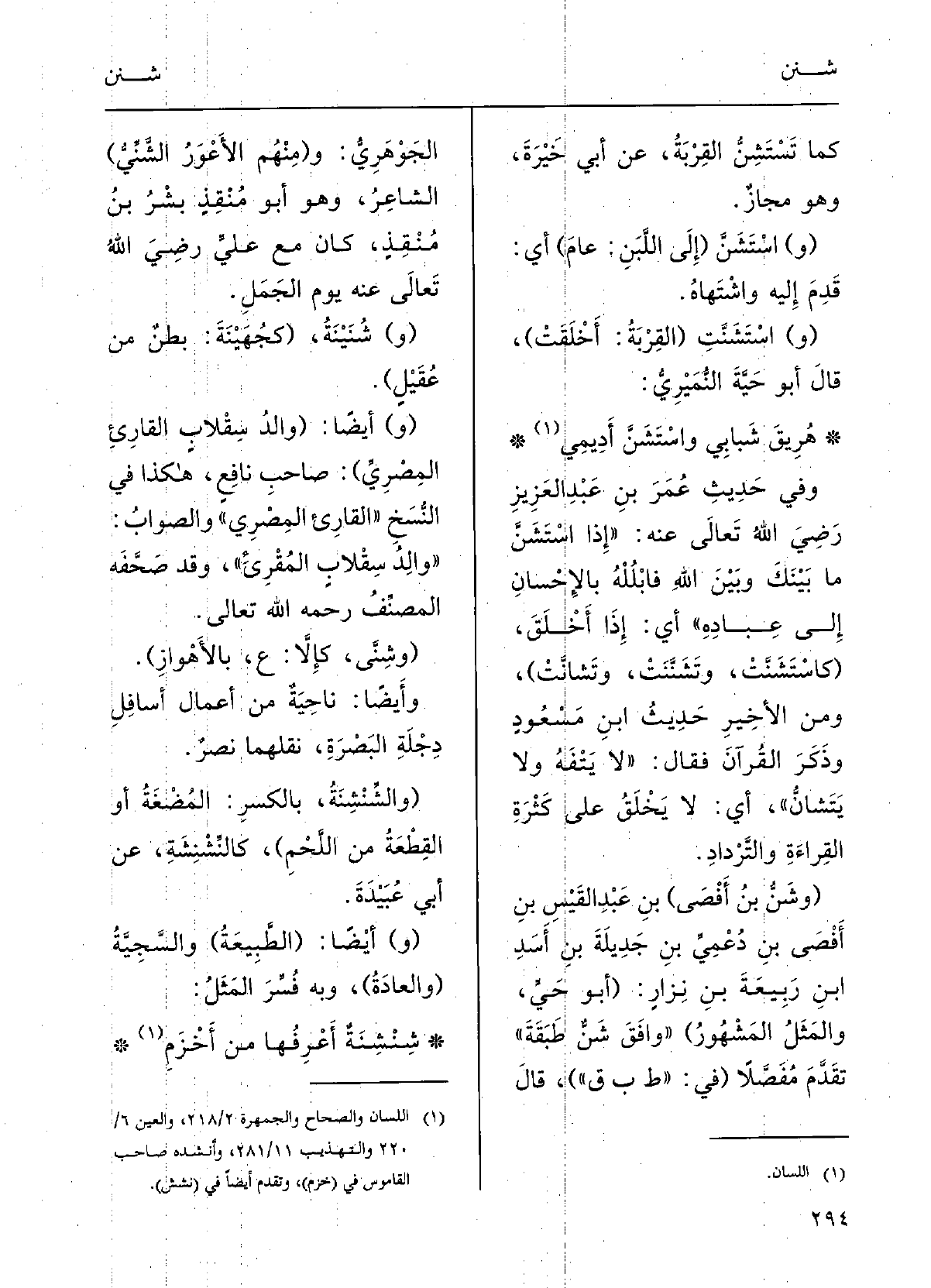 هُرِيقَ شَبابي} واسْتَشَنَّ أَدِيمِي وَفِي حدِيثِ عُمَر بنِ عبْدِ العَزيزِ، رضِيَ الّلهُ تَعَالَى عَنهُ: (إِذا {اسْتَشَنَّ مَا بَيْنك وبينَ الّلهُ فابْلُلْه بالإِحْسانِ إِلَى عبادِه) ، أَي إِذا أَخْلَقَ؛ (} كاسْتَشَنَّتْ {وتَشَنَّنَتْ} وتَشانَّتْ) ؛ ومِن الأخيرِ حدِيثُ ابنِ مَسْعود، وذَكَرَ القُرآن فقالَ: (لَا يَتْفَهُ وَلَا {يَتَشَانُّ، أَي لَا يَخْلَقُ على كثْرَةِ القِراءَةِ والتَّرْدادِ.
