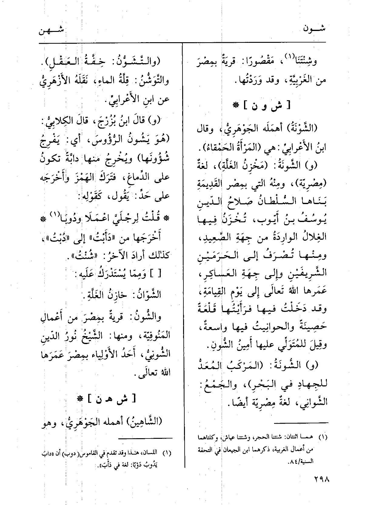 {والشونُ: قَرْيةٌ بمِصْرَ مِن أَعْمالِ المنوفيةِ، وَمِنْهَا الشيخُ نورُ الدِّيْن} الشونيُّ أَحدُ الأَوْلياءِ بمِصْرَ عمرَها الّلهُ تَعَالَى.