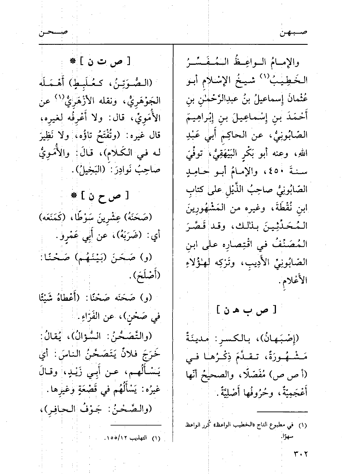 : (إِصْبَهانُ) ، بالكسْرِ: مَدينَةٌ مَشْهورَةٌ، تقدَّمَ ذِكْرُها (فِي (أص ص) مُفَصَّلاً، والصَّحِيحُ أنَّها أَعْجميَّة وحُرُوفُها أَصْلِيَّة.