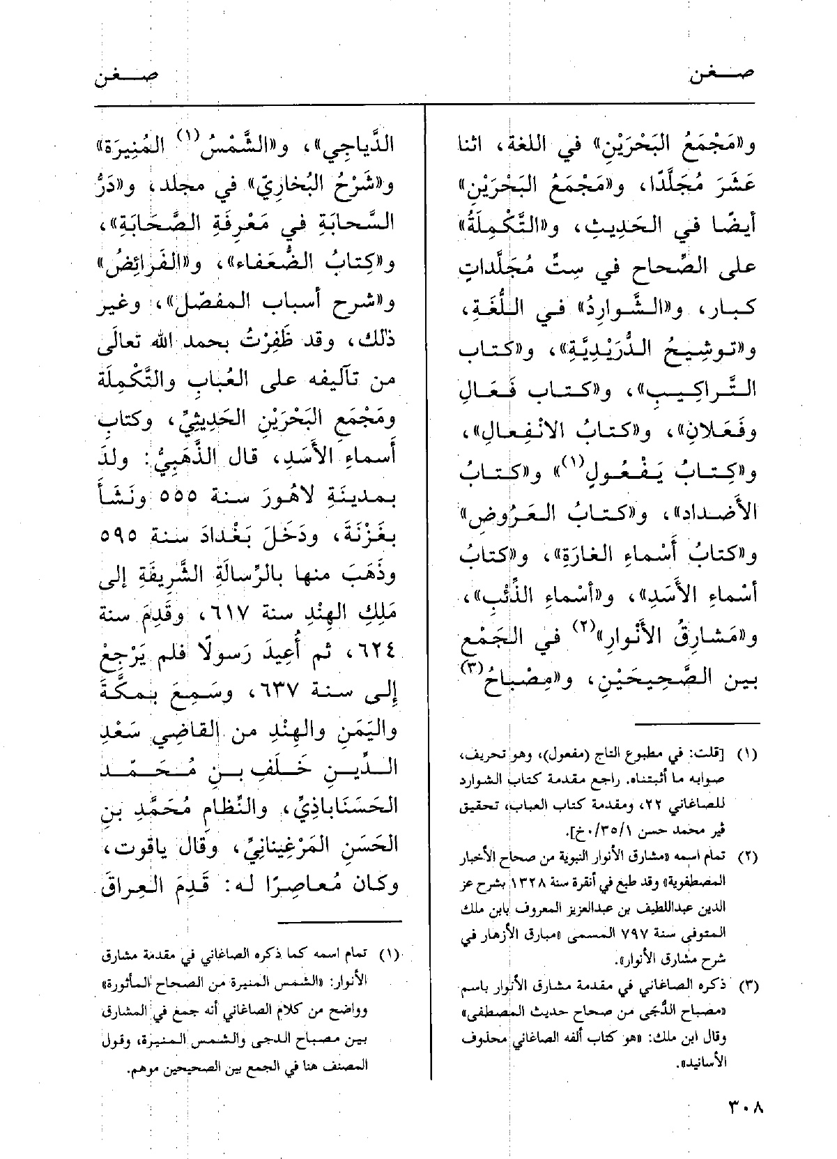 ومَجْمَعُ البَحْرَيْنِ فِي اللّغَةِ اثْنا عَشَرَ مجلداً، ومَجْمَعُ البَحْرَيْن أَيْضاً فِي الحدِيثِ، والتّكْمِلَةُ على الصِّحاحِ فِي ستِّ مجلَّدَات كبارٍ، والشوارِدُ فِي اللغَةِ، وتَوْشِيح الدريدية، وكِتابُ التَّراكِيبِ، وكِتابُ فعال وفعلان، وكِتابُ الانْفِعالِ، وكِتابُ مَفْعول، وكِتابُ الأَضْدادِ، وكِتابُ العَرُوضِ، وكِتابُ أَسْماءِ الغارَةِ، وكِتابُ أَسْماءِ الأَسَدِ، وأَسْماء الذِّئْب، ومشارِقِ الأَنْوارِ فِي الجَمْع بينَ الصَّحِيحَيْن، ومِصْباح الدّياجي، والشَّمْس المُنِيْرة، وشَرْح البُخارِي فِي مجلدٍ، ودُرّ السَّحابَة فِي مَعْرِفَة الصَّحابَة، وكِتابُ الضُّعَفاء والفَرائِض، وشَرْح أَسْباب المفصّل، وغَيْر ذلِكَ. وَقد ظَفِرْتُ بحَمْدِ الّلهِ تعالَى مِن تآلِيفِه على العُبابِ والتكْمِلَةِ ومَجْمَع البَحْرَيْن الحدِيثِي وكِتابِ أَسْماءِ الأسدِ.