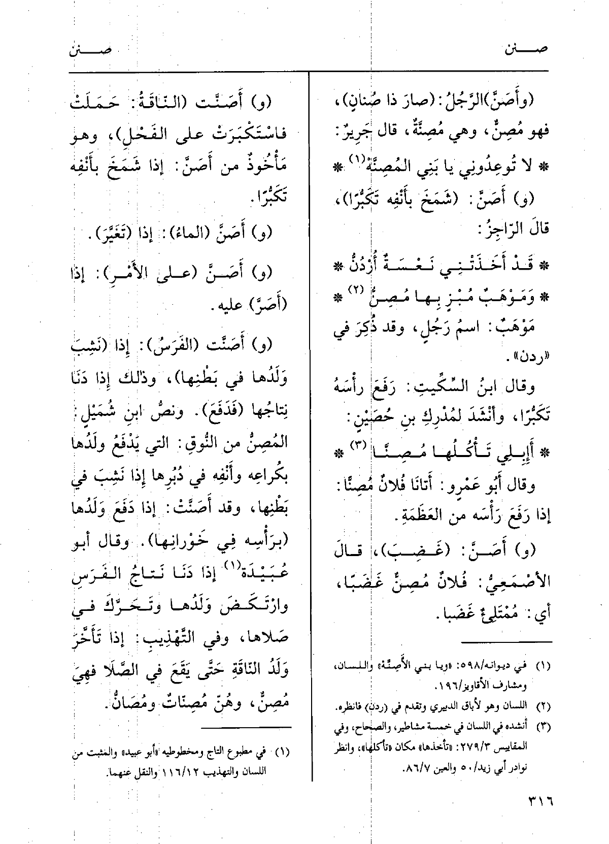 وَفِي التَّهْذيبِ: وَإِذا تأَخَّرَ وَلَدُ الناقَةِ حَتَّى يَقَعَ فِي الصّلا فَهُوَ مُصِنٌّ وَهن {مُصِنَّات} ومُصَانُّ.