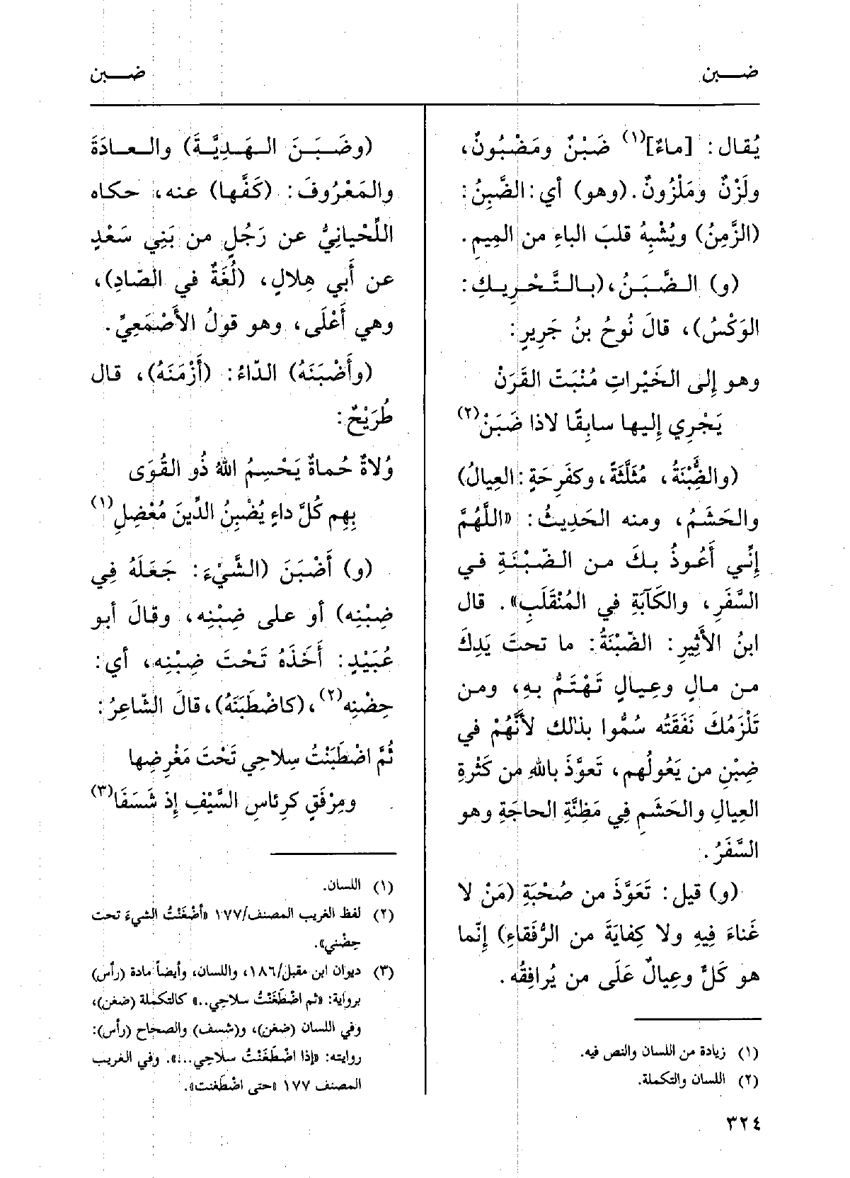 وَهُوَ إِلَى الخَيراتِ مُنْبَتُّ القَرَنْيَجْري إِلَيْهَا سابِقاً لَا ذَا ضَبَنْ (والضِِبنَةُ، مُثَلَّثَةً وكفَرِحَةٍ: العِيالُ) والحَشَمُ؛ وَمِنْه الحدِيثُ: (اللهُمَّ إنِّي أَعُوذُ بك مِن الضُِّبْنة فِي السَّفَر والكآبَةِ فِي المُنْقَلَب) .