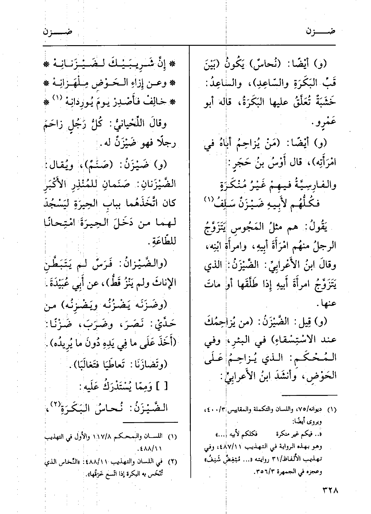 إِن شَرِيبَيْكَ لَضَيْزنانِهْوعن إِزاءِ الحَوْضِ مِلْهَزانِهْخالِفْ فأَصْدِرْ يومَ يُورِدانِهْوقالَ اللَّحْيانيُّ: كلُّ رجُلٍ زَاحَمَ رجلا فَهُوَ ضَيْزَنٌ لَهُ.