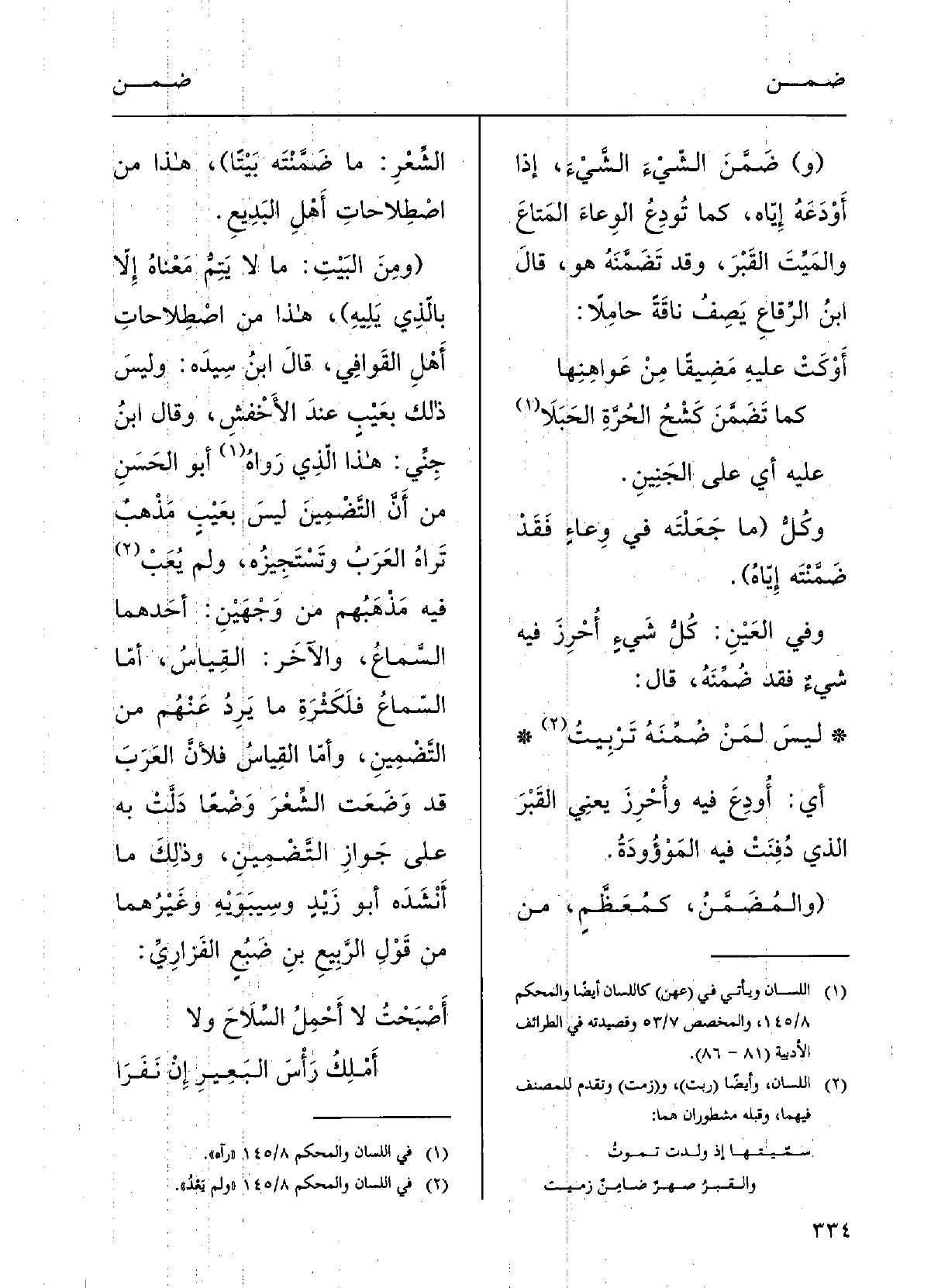 وقالَ ابنُ جنيِّ: هَذَا الَّذِي رَوَاه أَبو الحَسَنِ مِن أنَّ التَّضْمِينَ ليسَ بعَيْبٍ، مَذْهب تَراهُ العَرَبُ وتَسْتَجِيزُه، وَلم يعب فِيهِ مَذْهبَهم مِن وَجْهَيْن: أَحدُهما السّماعُ، والآخَرُ: القِياسُ، أَمَّا السّماعُ فلكَثْرَةِ مَا يردُ عَنْهُم مِن التَّضْمِين، وأَمَّا القِياسُ فلأنَّ العَرَبَ قد وَضَعَتِ الشِّعْرَ وَضْعاً دلَّتْ بِهِ على جَوازِ التَّضْمِين، وذلِكَ مَا أَنْشَدَه أَبو زَيْدٍ وسِيْبَوَيْه وغيرُهما مِن قوْلِ الرَّبيعِ بنِ ضَبُعٍ الفَزَاريّ: