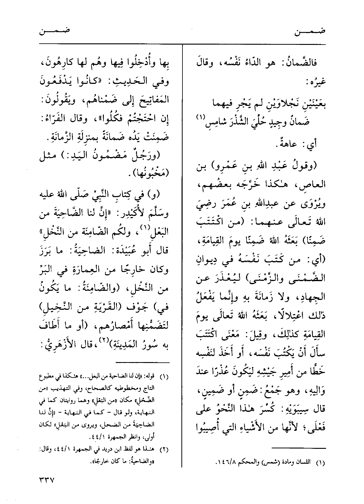 قالَ أَبو عُبَيْدَةَ: الضَّاحِيَة مَا بَرَزَ وكانَ خارِجاً مِنَ العِمَارَةِ فِي البَرِّ مِن النَّخْل؛ (والضَّامِنَةُ مَا يكونُ فِي) جَوْفِ (القَرْيَةِ مِن النَّخيلِ) لتضمنها أَمْصَارهم، (أَو مَا أَطافَ بِهِ سُورُ المَدِنيةِ) .