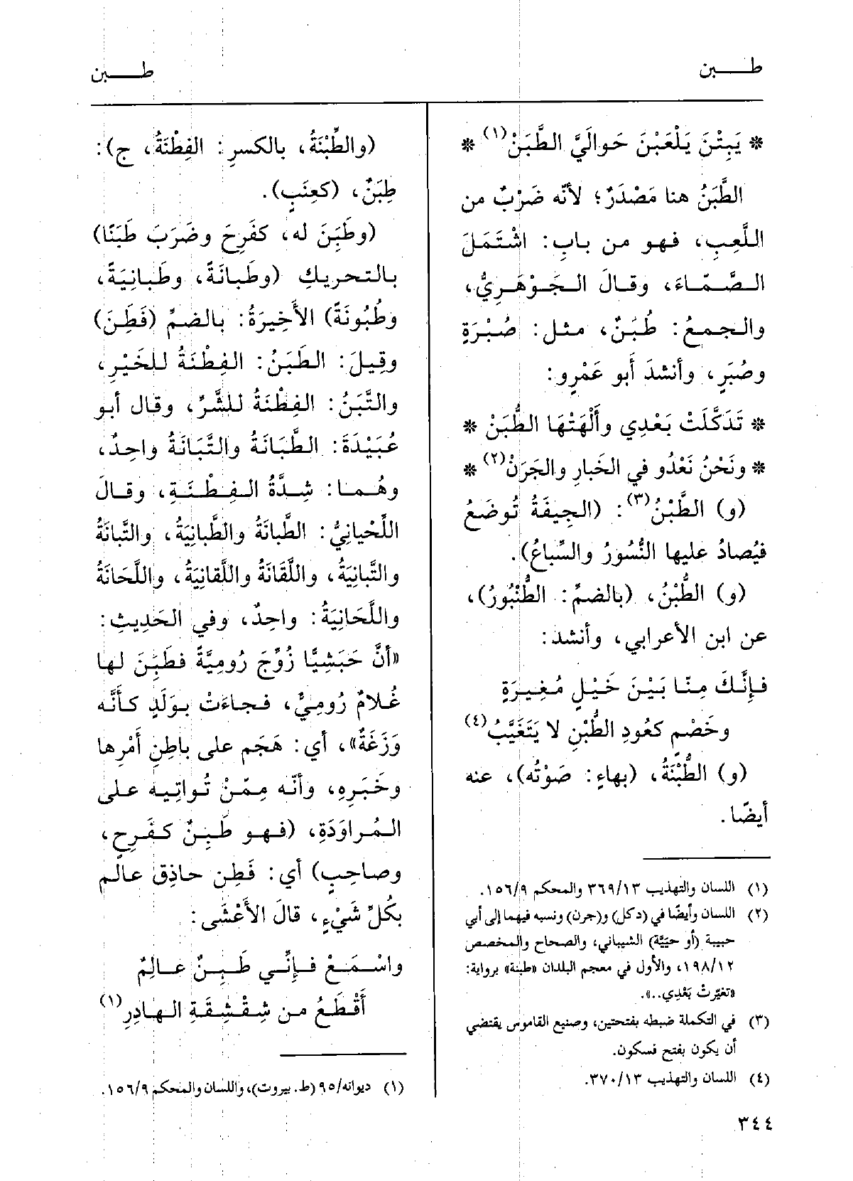 تَدَكَّلَتْ بَعْدِي وأَلْهَتْها الطُّبَنْونَحْنُ نَعْدُو فِي الخَبَارِ والجَرَنْ (و) الطَّبَنُ: (الجِيفَةُ تُوضَعُ فَيُصادُ عَلَيْهَا النُّسورُ والسِّباعُ.