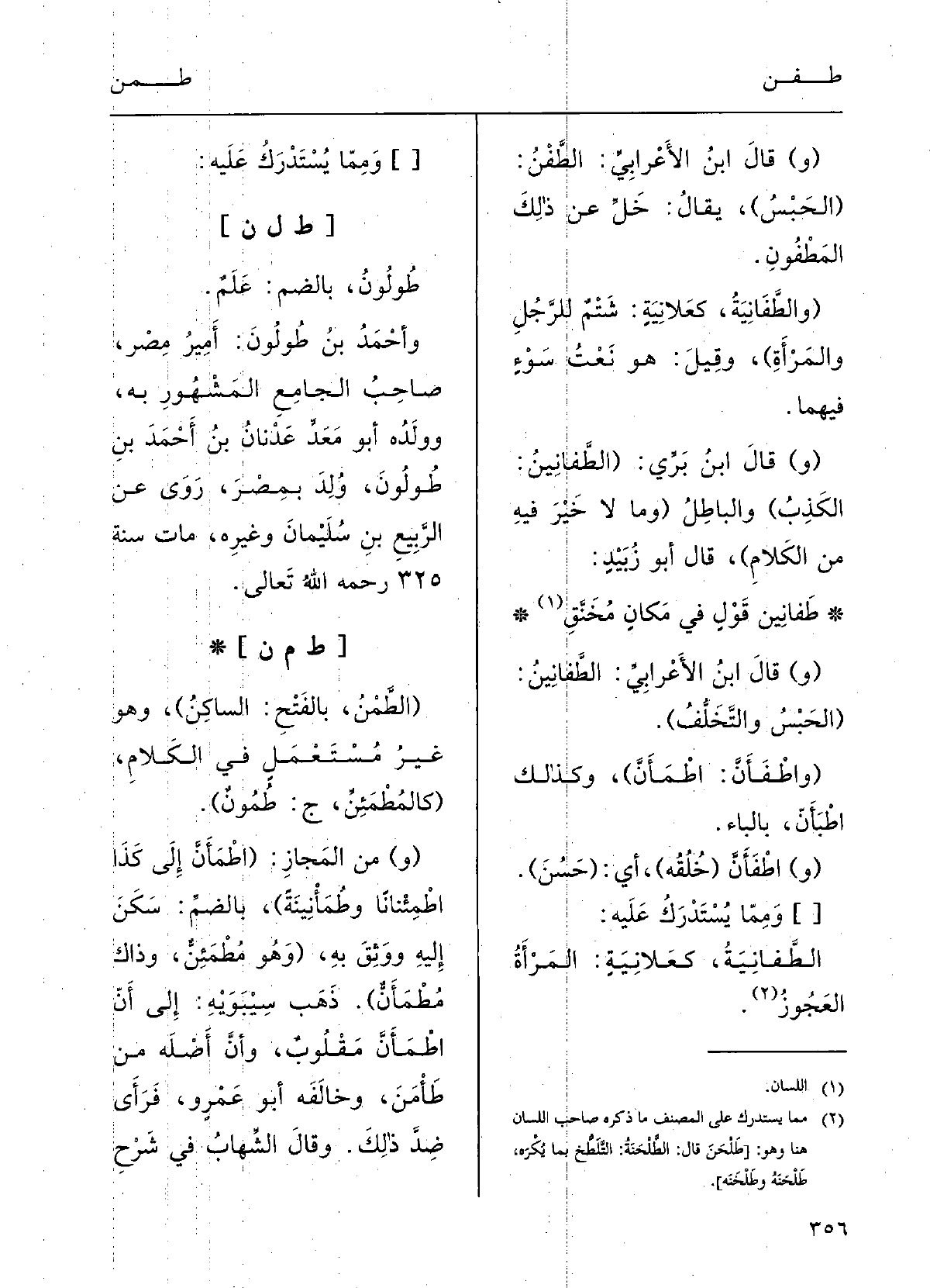 :) طُولُون، بالضمِّ: عَلَمٌ؛ وأَحمدُ بنُ طُولُون، أَميرُ مِصْر صاحِبُ الجامِعِ المَشْهور بِهِ، وولدُه أَبو معد عَدْنانُ بنُ أَحمدَ بنِ طُولُون، وُلِدَ بمِصْرَ رَوَى عَن الرَّبيعِ بنِ سُلَيْمان وغيرِهِ، ماتَ سَنَة 325، رحِمَه اللهاُ تَعَالَى.