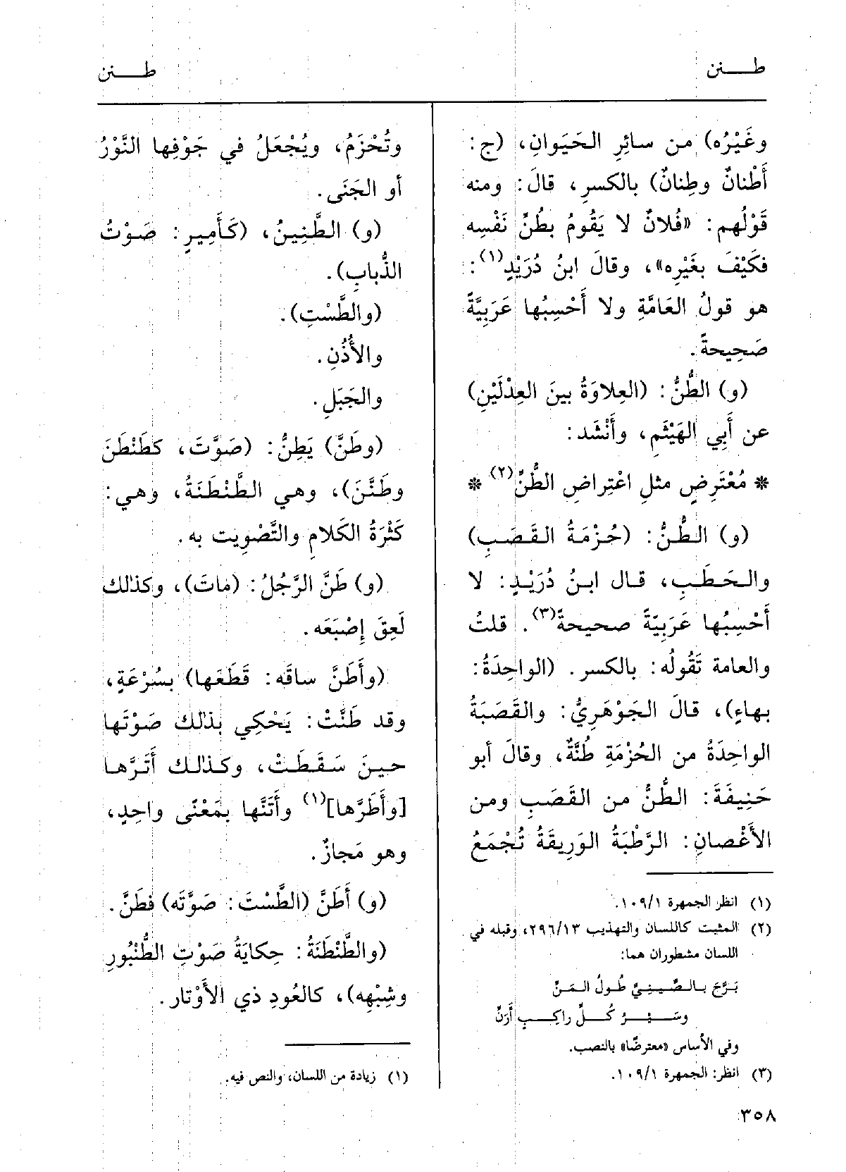 (و) } طَنَّ الرَّجلُ: (ماتَ) ، وكذلِكَ لَعِقَ إصْبَعَه.