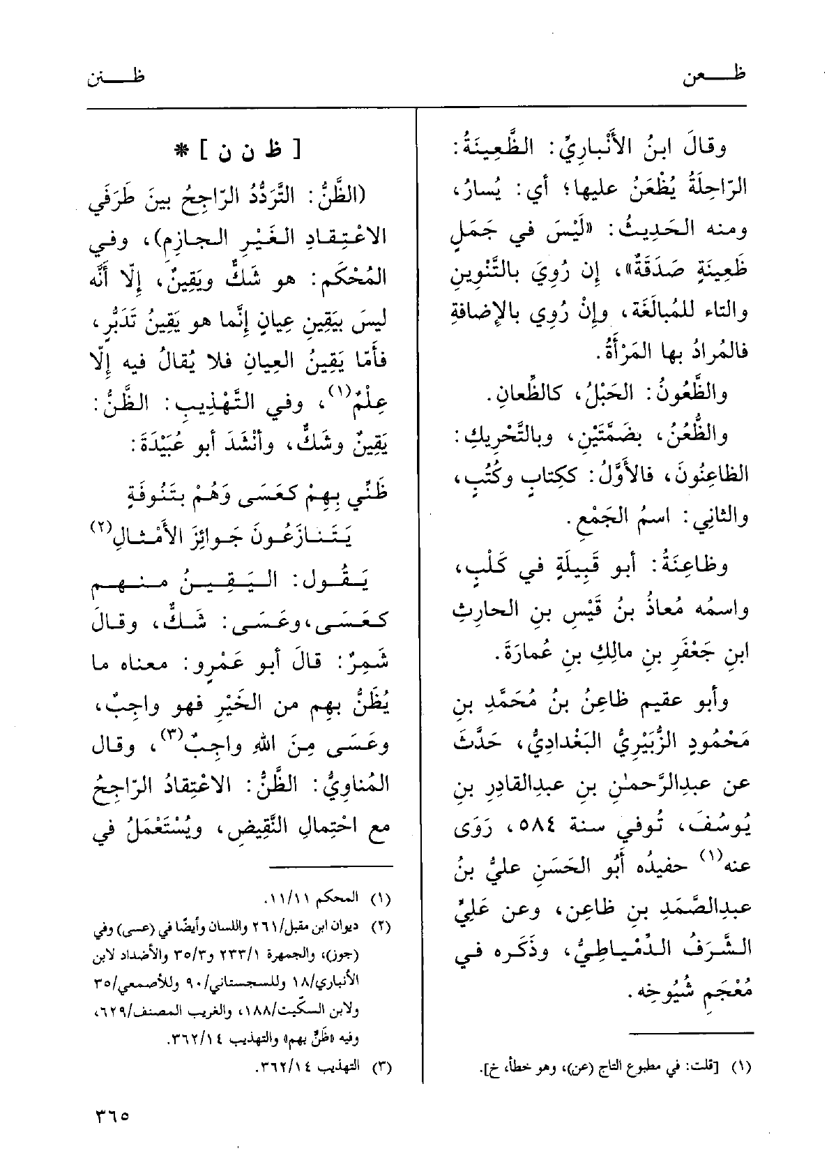 : ( {الظَّنُّ: التَّرَدُّدُ الَّراجِحُ بَين طَرَفَي الاعْتِقادِ الغيرِ الجازِمِ) .