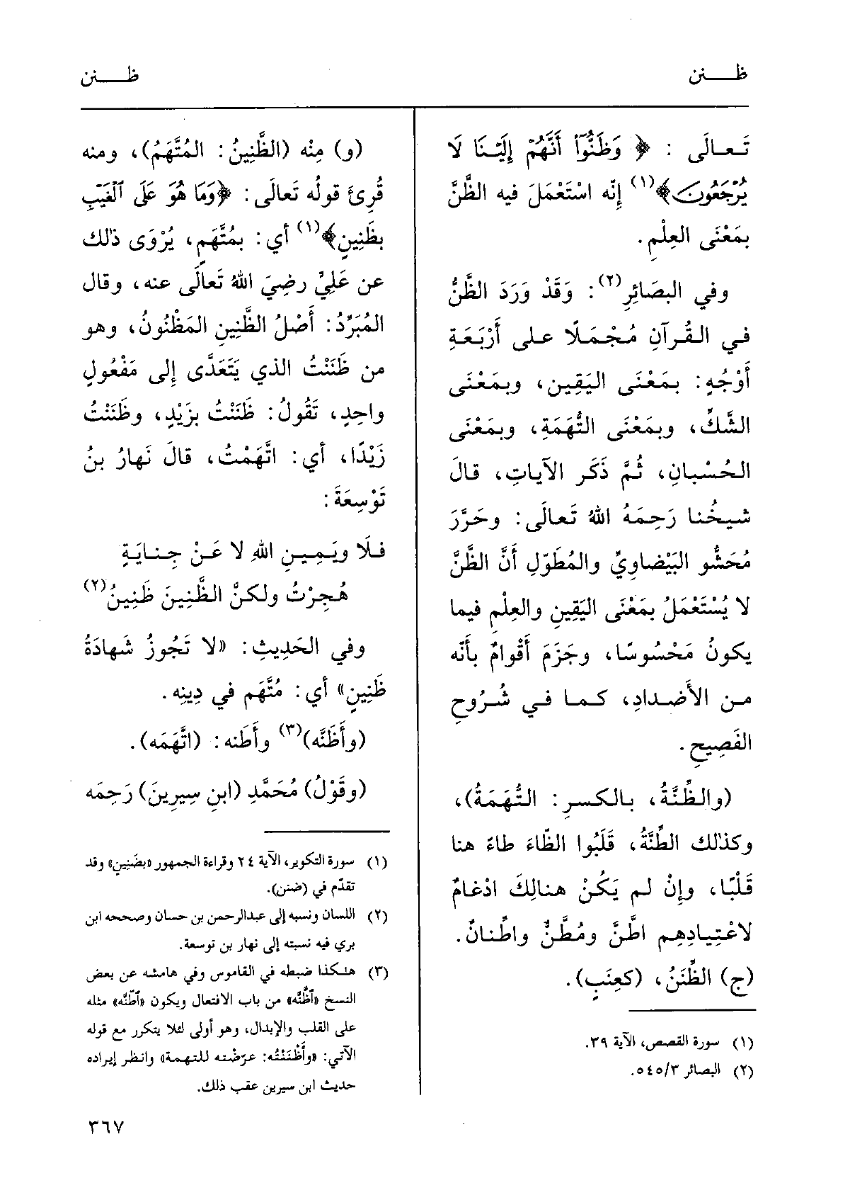 وَفِي البَصائِرِ: وَقد وَرَدَ الظّنُّ فِي القُرْآن مُجْملاً على أَرْبَعةِ أَوْجهٍ: بمعْنَى اليَقِينِ، وبمعْنَى الشَّكّ، وبمعْنَى التّهْمةِ، وبمعْنَى الحسْبَان، ثمَّ ذَكَرَ الْآيَات.