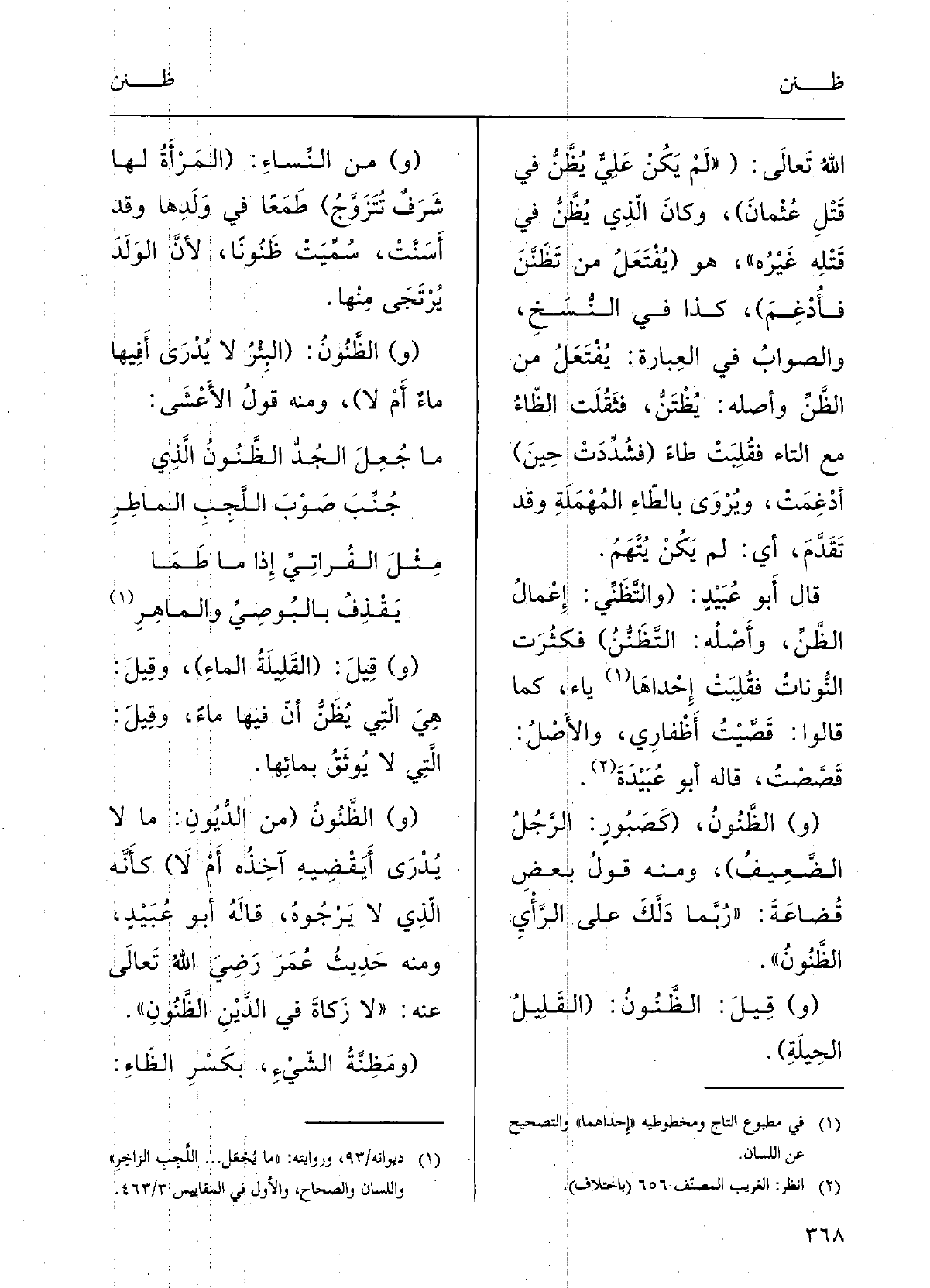الله تَعَالَى: (لم يكنْ عليٌّ {يُظَّنُّ فِي قَتْلِ عُثْمانَ) ، وكانَ الَّذِي يُظَّنُّ فِي قَتْلِه غيرِهِ، هُوَ (يُفْتَعَلُ مِن} تَظَنَّنَ فأُدْغِمَ) ، كَذَا فِي النُّسخِ، والصَّوابُ فِي العِبارَةِ يُفْتَعَلُ مِن الظَّنِّ، وأَصْلُه {يُظْتَنُّ، فثُقِّلَتِ الظا مَعَ التاءِ فقُلِبَتْ ظاء (فشُدِّدَتْ حينَ) أُدْغِمَتْ، ويُرْوَى بالطاءِ المهْمَلَةِ وَقد تقدَّمَ، أَي لم يكنْ يُتَّهَمُ.