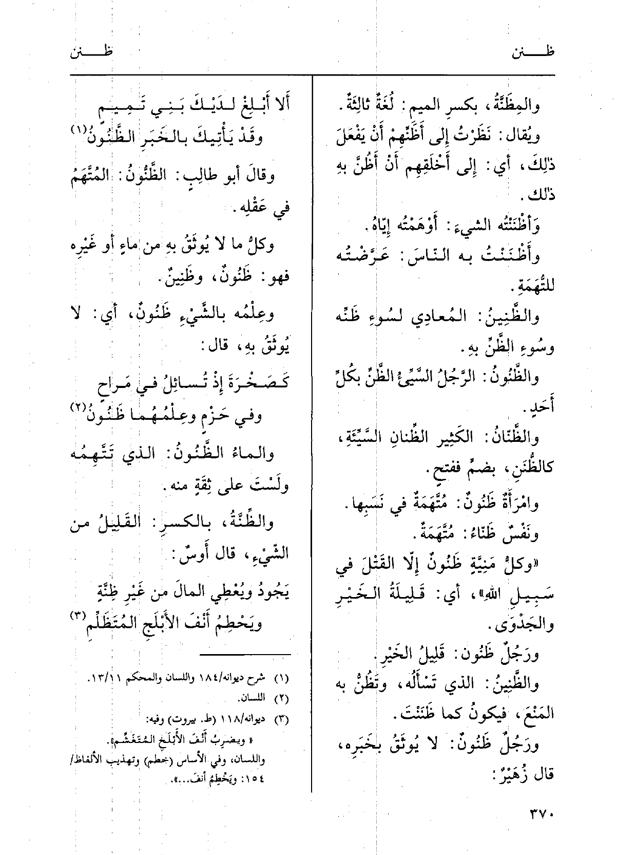 أَلا أَبْلِغْ لدَيْكَ بَني تَمِيمٍ وَقد يَأْتِيك بالخَبرِ الظَّنُونُوقالَ أَبو طالبٍ: الظَّنُونُ: المُتَّهَمُ فِي عَقْلِه، وكلُّ مَا لَا يُوثَقُ بِهِ مِن ماءٍ أَو غيرِهِ فَهُوَ {ظَنُونٌ} وظَنِينٌ.