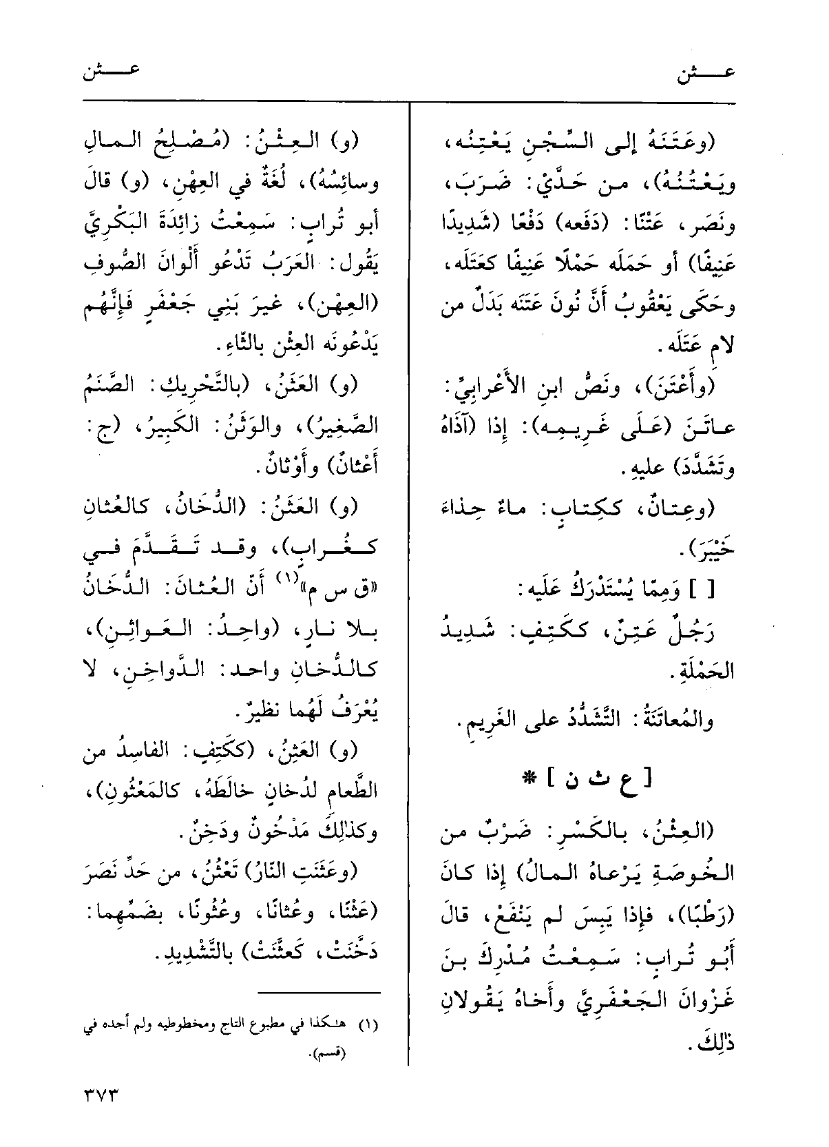 (و) العَثَنُ: (الدُّخانُ، كالعُثانِ، كغُرابٍ) ، وَقد تقدَّمَ فِي قسم أَنَّ العُثانَ الدُّخانُ بِلا نارٍ، (واحِدُ العَواثِنِ) ، كالدُّخانِ واحِد الدَّواخِنِ، لَا يُعْرَفُ لَهما نَظِيرٌ.