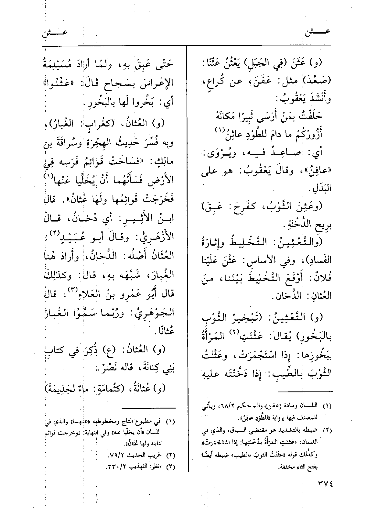 قالَ الأَزْهريُّ: وقالَ أَبو عُبَيْد: العُثانُ أَصْلُه الدُّخان، وأَرادَ هُنَا الغُبَار شَبَّهه بِهِ؛ قالَ: وكذلِكَ قالَ أَبو عَمْرو بنُ العَلاءِ.