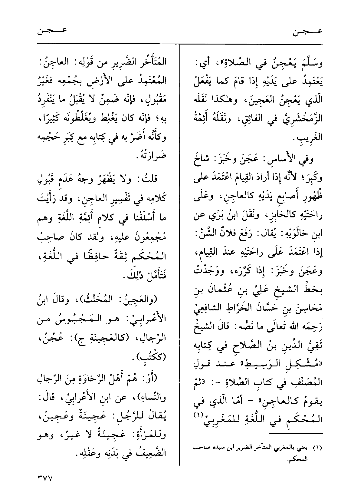 أَمَّا الَّذِي فِي المُحْكَم فِي اللّغَةِ للمَغْربيّ المُتأَخِّر الضَّريرِ مِن قَوْلِه: العاجِنُ المُعْتَمِدُ على الأَرْضِ بجُمْعِه فغَيْرُ مَقْبولٍ فإنَّه ضمن لَا يقْبل مَا يَنْفَردُ بِهِ، فإنَّه كانَ يغلطُ ويغلطونَهُ كَثيراً، وكأَنَّه أَضَرَّ بِهِ فِي كتَابِهِ مَعَ كبرِ حَجْمِه ضَرارَته، اه.