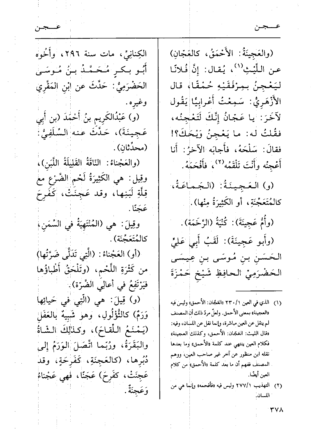 قالَ الأزْهرِيُّ: سَمِعْتُ أَعْرابيًّا يقولُ لآخَر: يَا عَجَّان إنّك لتَعْجِنُه، فقلْتُ لَهُ: مَا يَعْجِنُ وَيْحَكَ؛ فقالَ: سَلْحه، فأَجابَهُ الآخَرُ: أَنا أَعْجِنُه وأَنْت تَلْقَمُه فأَفْحَمَه.