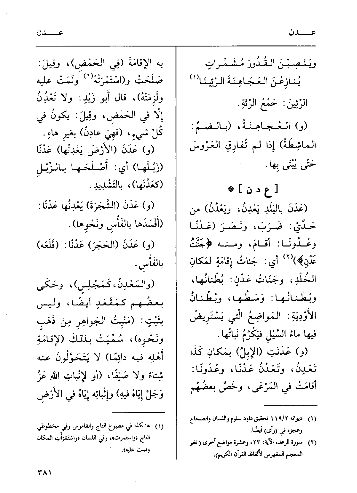 (عَدَنَ بالبَلَدِ يَعْدِنُ ويَعْدُنُ) ، مِن حَدَّيْ ضَرَبَ ونَصَرَ، (عَدْناً وعُدُوناً: أَقَامَ؛ وَمِنْه: {جَنَّاتُ عَدْنٍ} ، أَي) جَنَّاتُ إقامَةٍ لمَكانِ الخُلْدِ، وجَنَّاتُ عَدْنٍ: بُطْنانُها، وبُطْنانُها: وَسَطُها؛ وبُطْنانُ الأَوْديَةِ: المَواضِعُ الَّتِي يَسْتَرْيِضُ فِيهَا ماءُ السَّيْلِ فيَكْرُمُ نَباتُها.