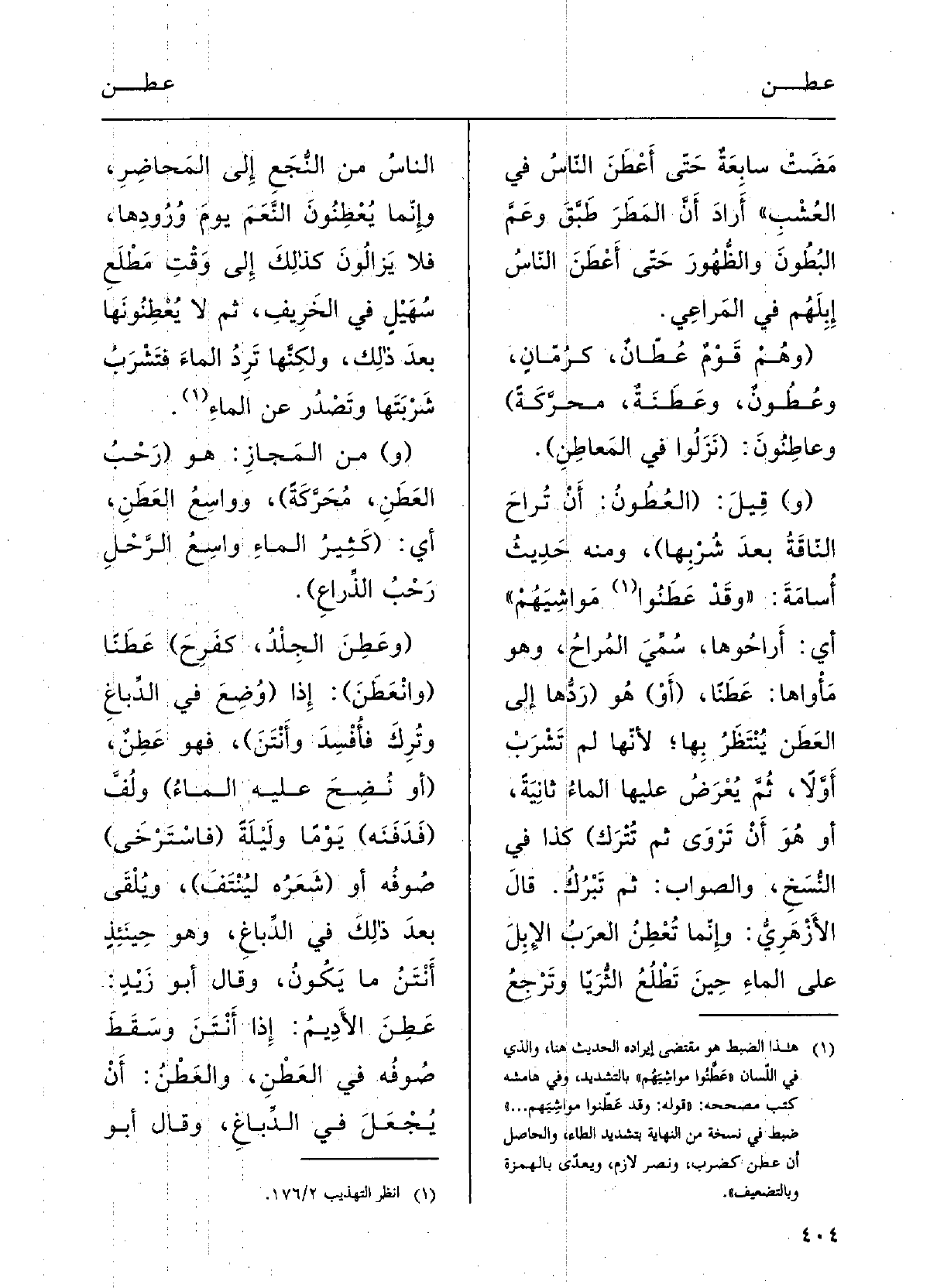 (وهُم قومٌ عُطَّانٌ، كرُمَّانٍ، وعُطونٌ وعَطَنَةٌ، محرّكةً) ، وعاطِنونَ: (نَزَلُوا فِي المَعاطِنِ.